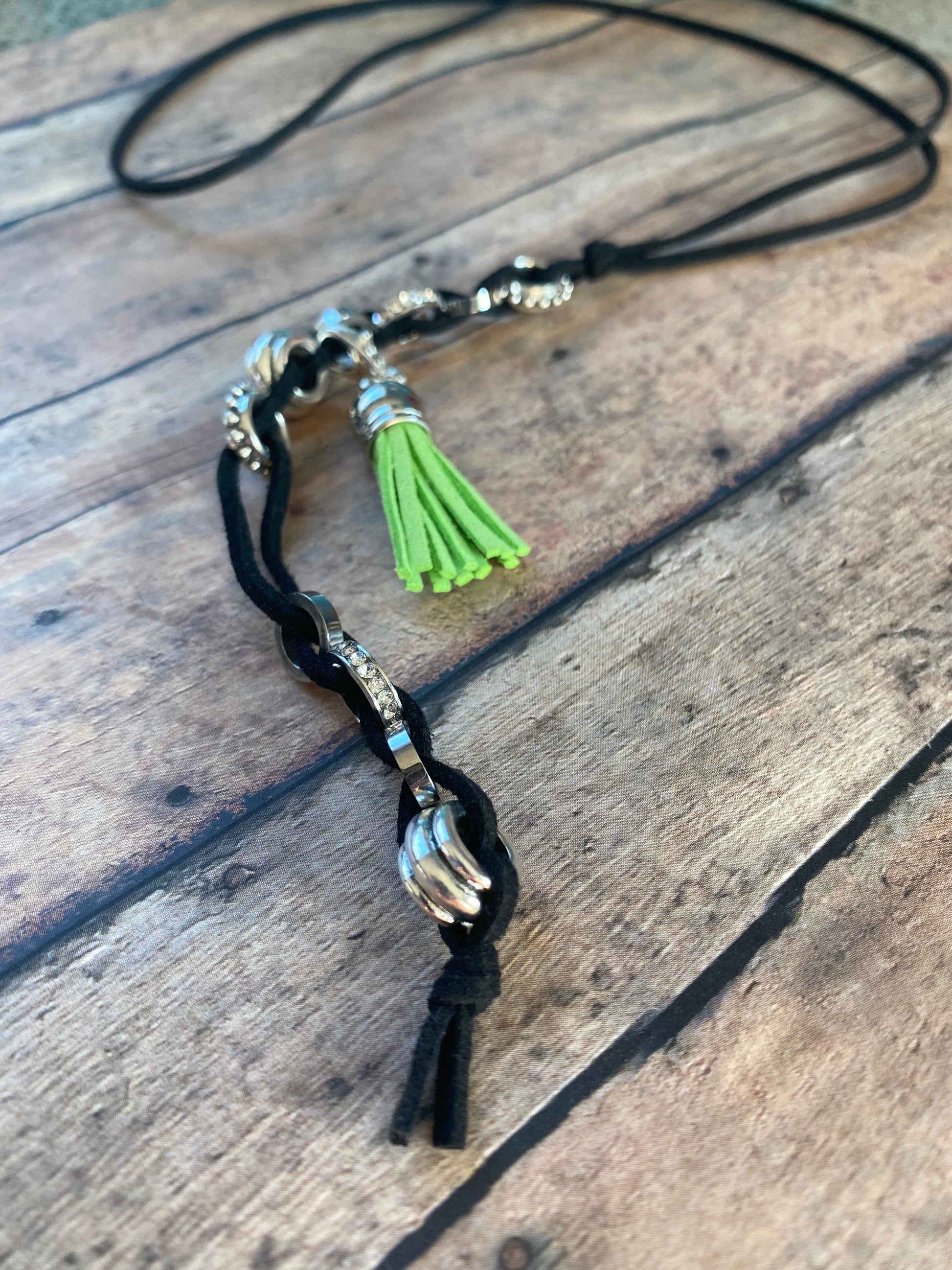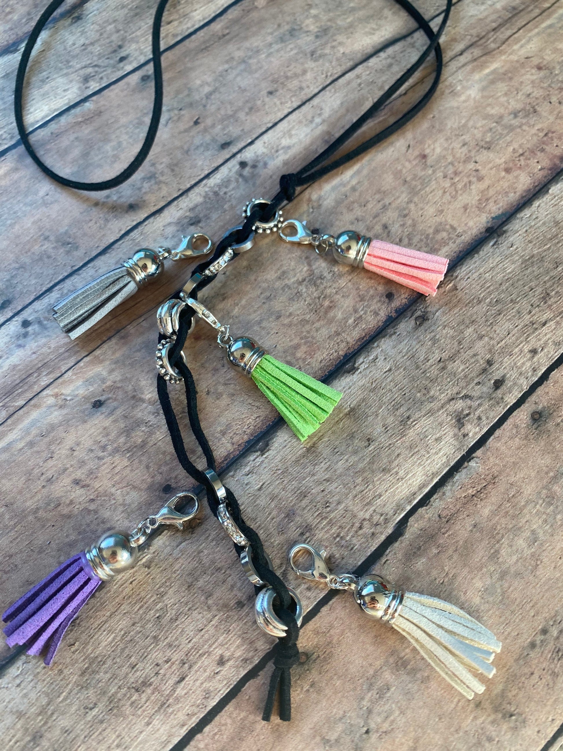 Necklace arrives with one tassel progress keeper, in the color of your choice (shown in third photo):