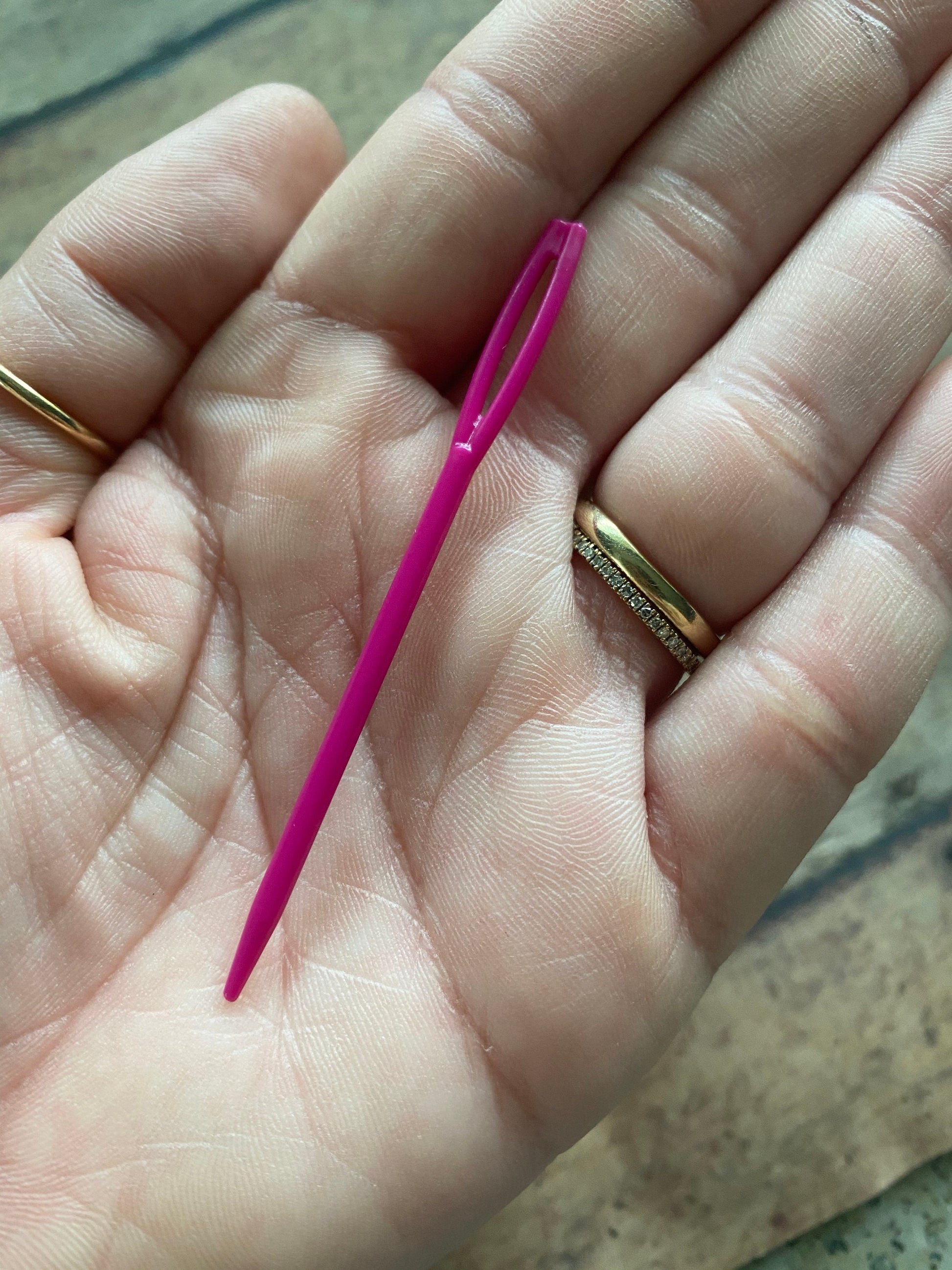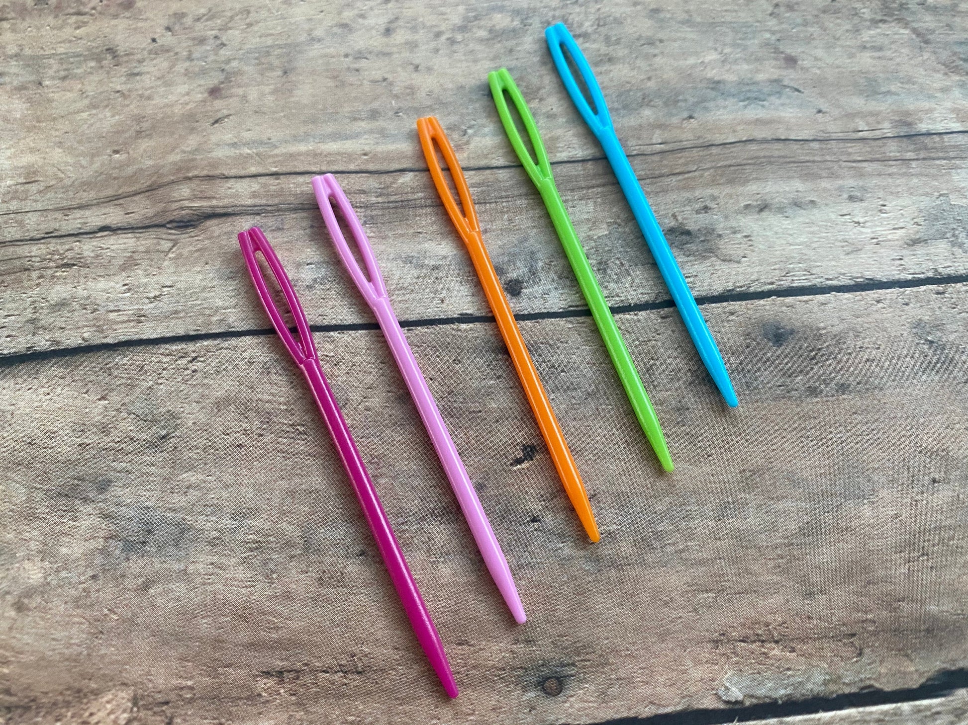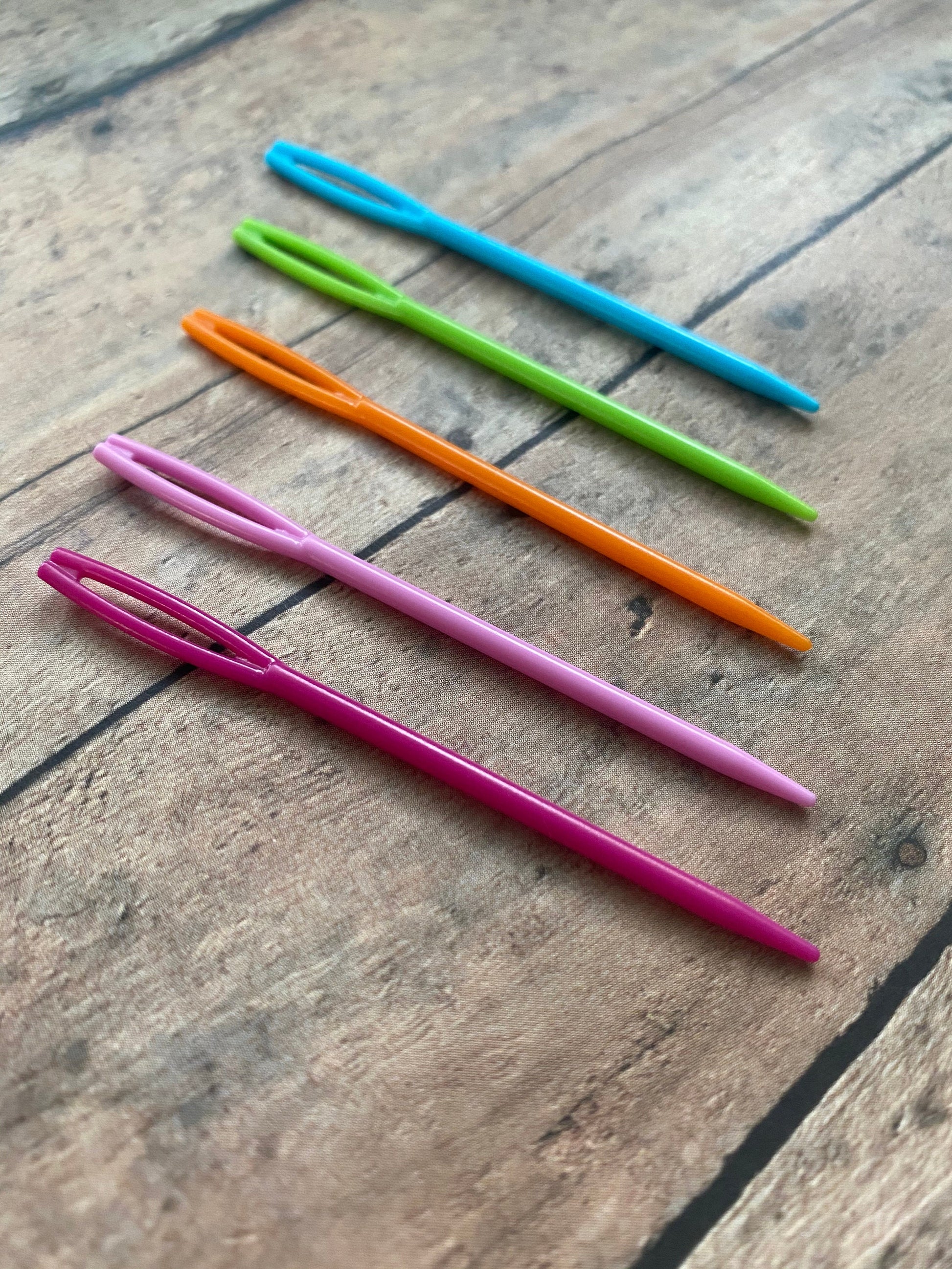 Large-eyed, plastic needles are here! Weave in your ends snag-free with these beauties, packaged in a set of 5 coordinating colors. You’ll receive one each of bright pink, baby pink, orange, green, and blue. Needles measure approximately 2.75 in/7cm long.