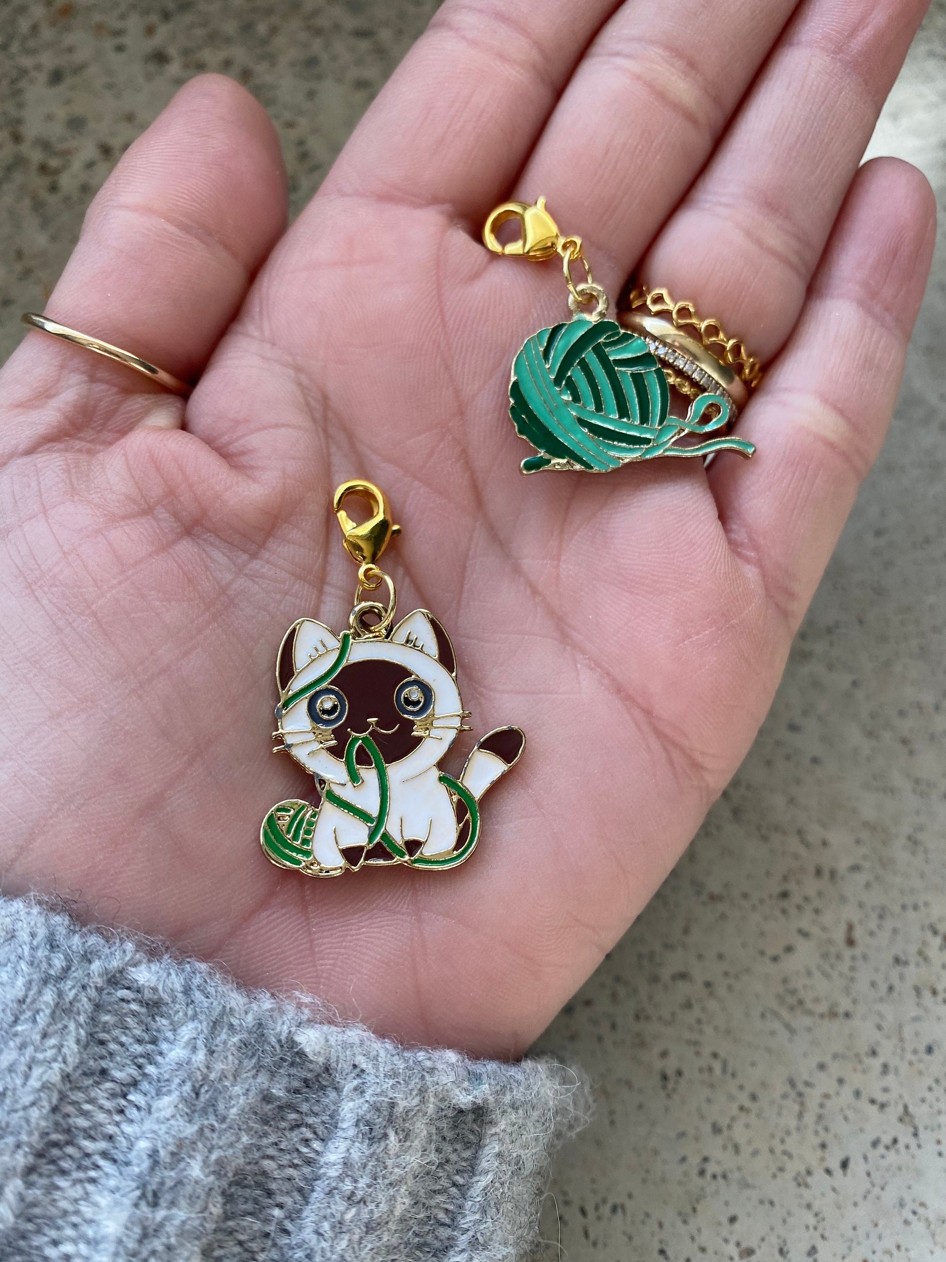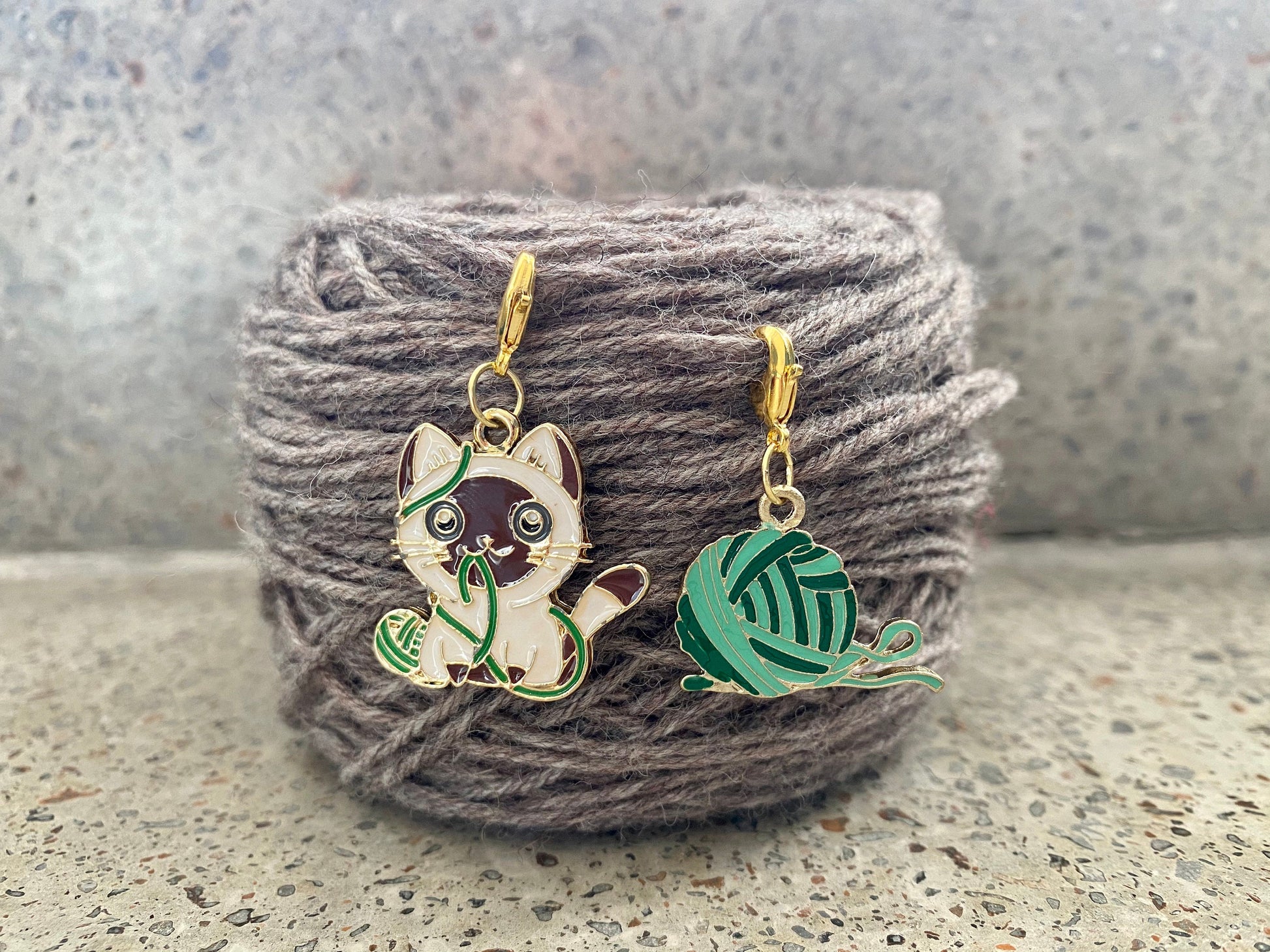 Meow! This naughty kitty has gotten himself all tangled up in yarn! Don’t worry though, he comes with a lovely, wound ball, too! Styled in bright, enamel charms that have been handwired onto golden lobster clasps. They would even be cute as zipper pulls! Your purchase includes both project keepers.