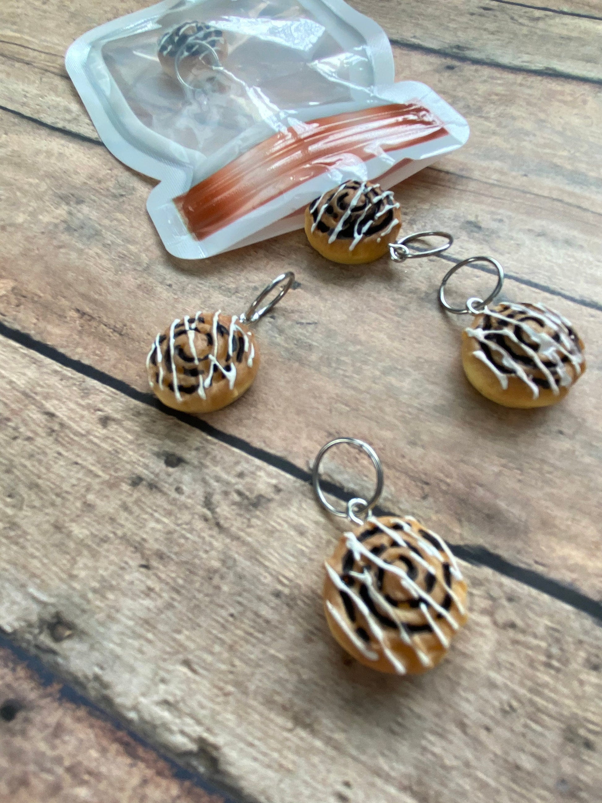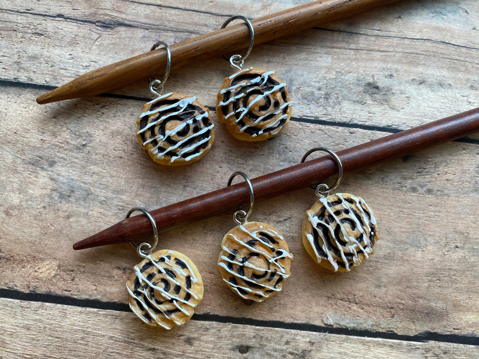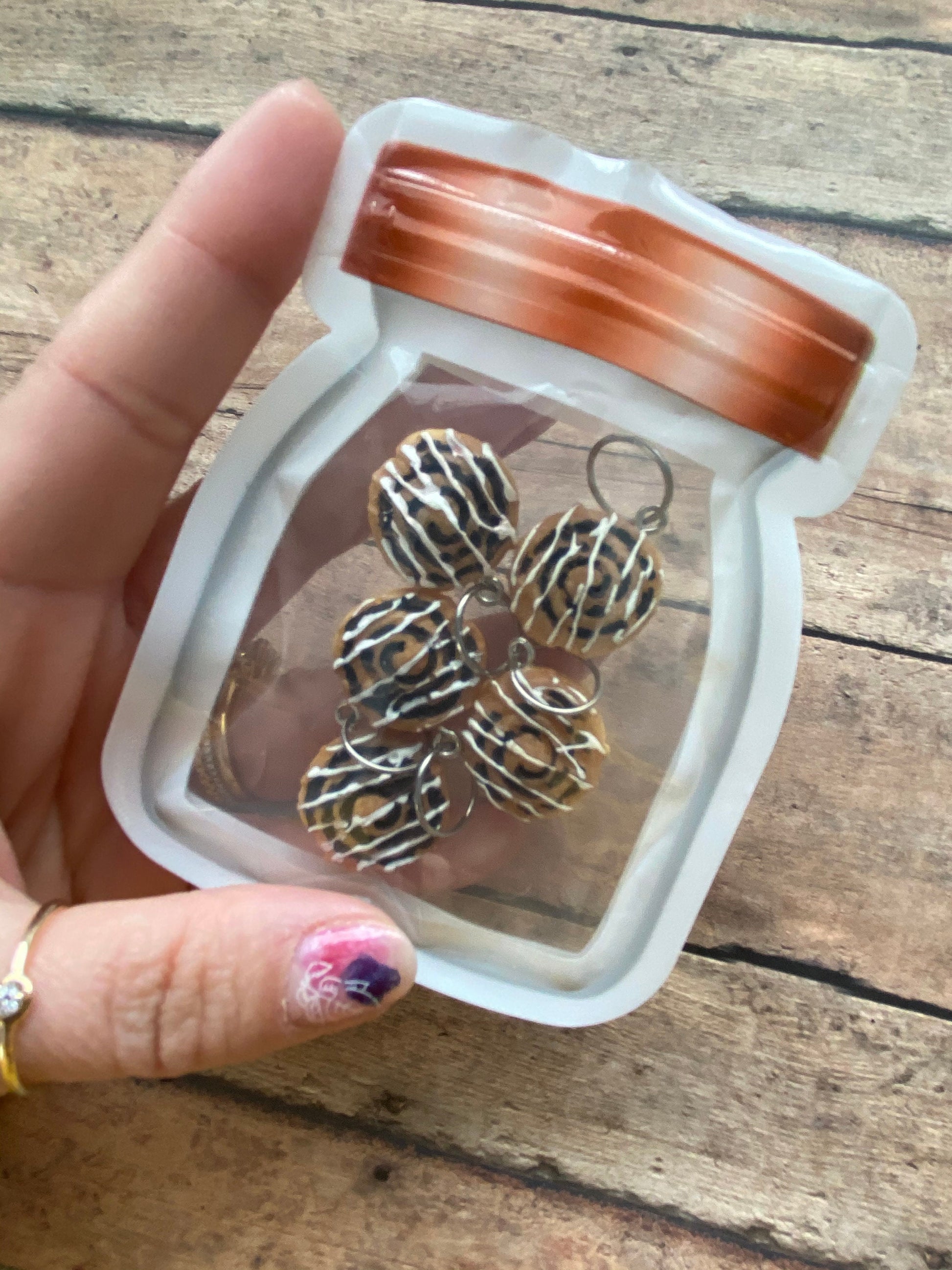 Cinnamon rolls, anyone? I have to admit, slathered with cream cheese frosting, they’re one of my favorite treats. This set of 5 rolls, perfectly recreated in lightweight acrylic, has been finished with silver toned jumprings that will fit up to a US 11/8 mm needle. They arrive in a thick, resealable plastic bag shaped like a tiny mason jar. The “jar” measures approximately 3” wide and 4” tall, and is printed with a copper “lid” on both sides. It’s clear in the middle so you can see your markers! So cute.