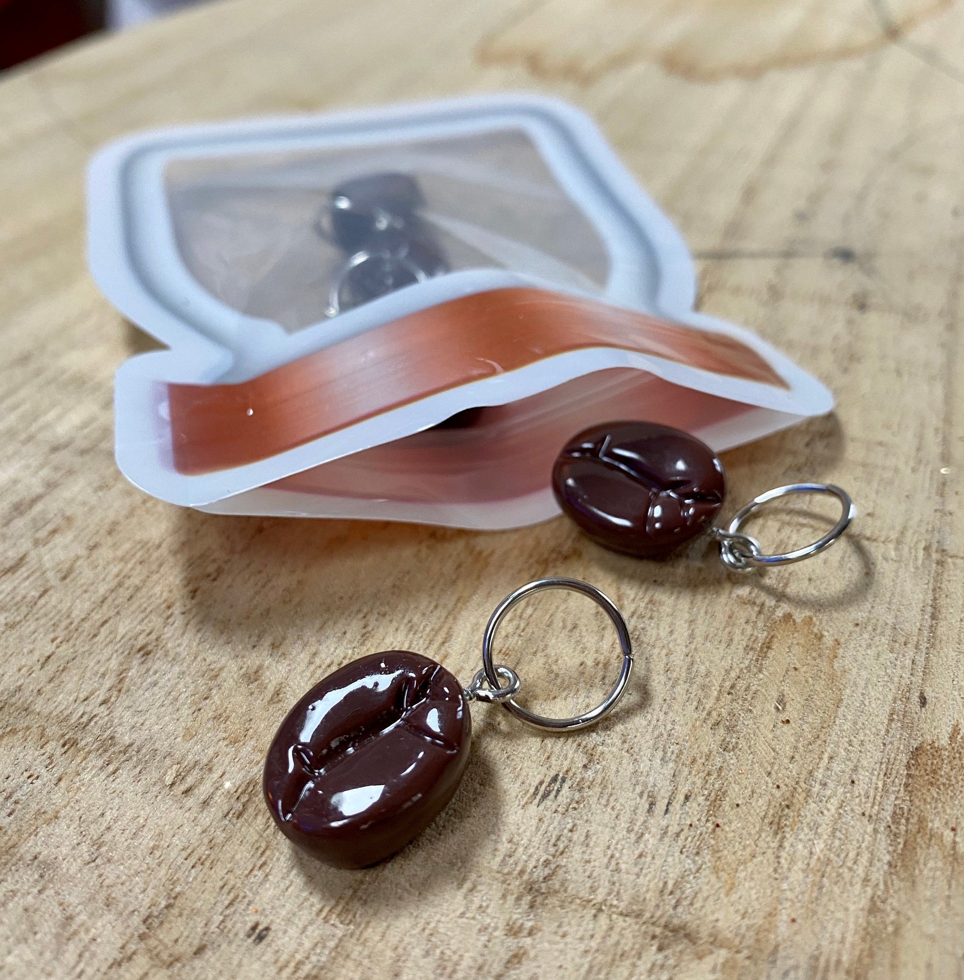 I couldn’t help myself. As soon as I saw these tiny, resealable plastic bag “mason jars”, I went on a quest to find the perfect charms to go inside them. Wouldn’t you know it, I found polymer clay coffee beans! Perfect. Y’all, it doesn’t get much cuter than this. The set of 5 coffee beans has been finished with silver toned jumprings that will fit up to a US 11/8 mm needle. They arrive in a thick, resealable plastic bag shaped like a tiny mason jar. The “jar” measures approximately 3” wide and 4” tall, and is printed with a copper “lid” on both sides. It’s clear in the middle so you can see your markers! So cute.
