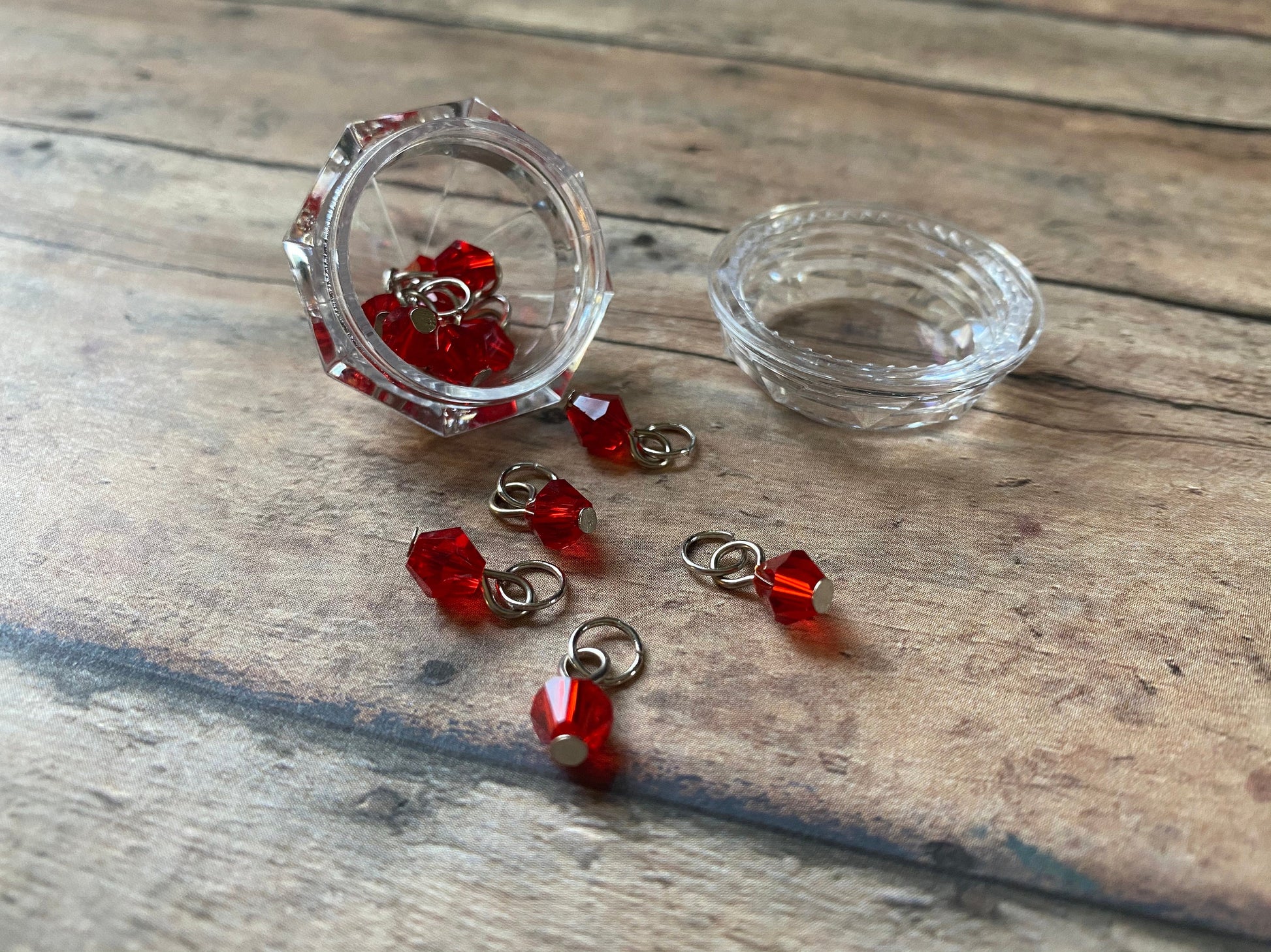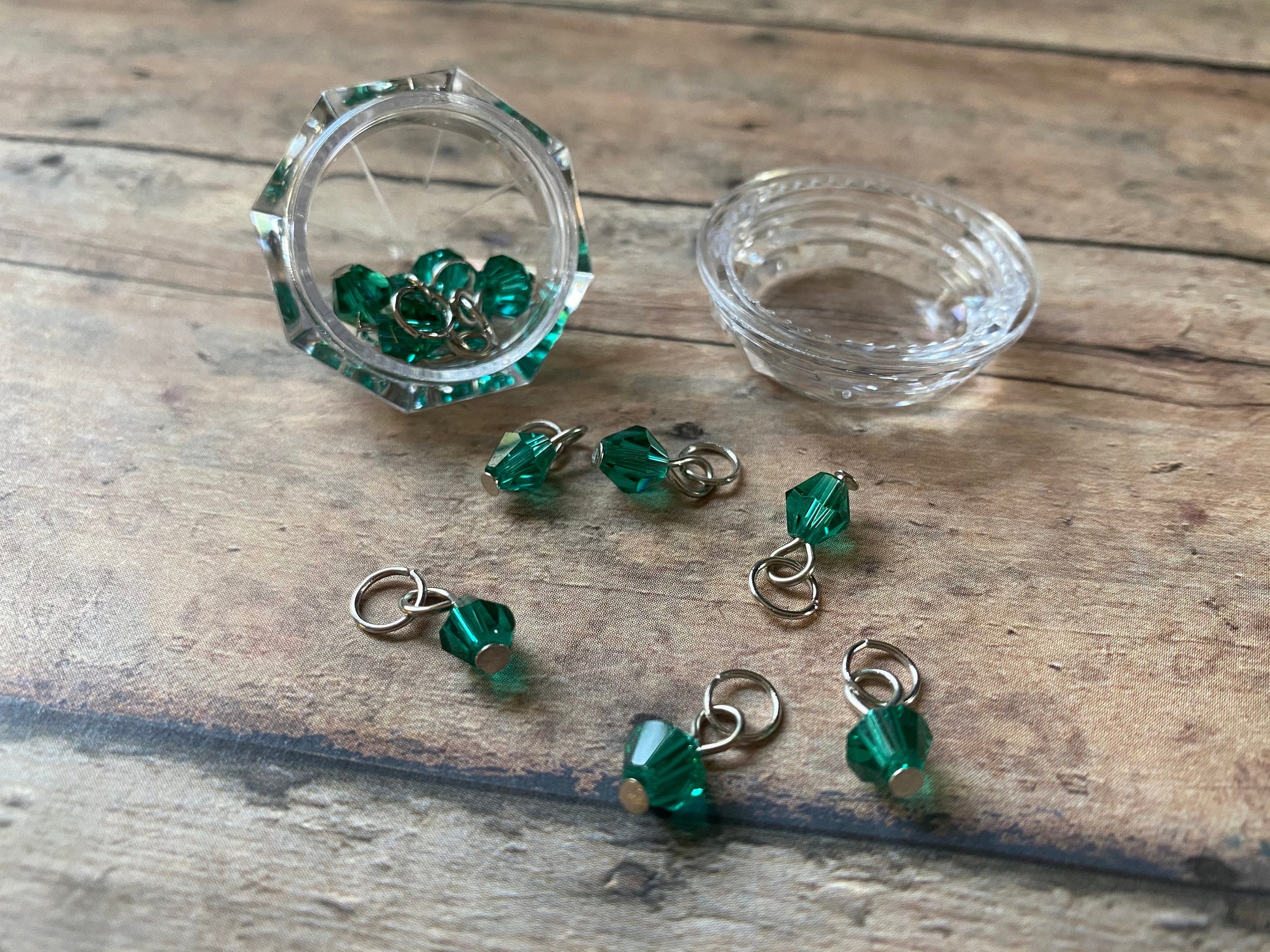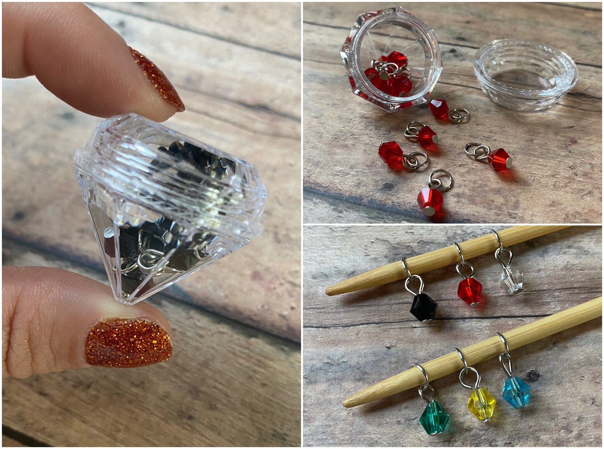 Each set of 12 crystal stitch makers have been hand wired onto silver toned jumprings that will fit up to a US 4/3.5 mm needle.