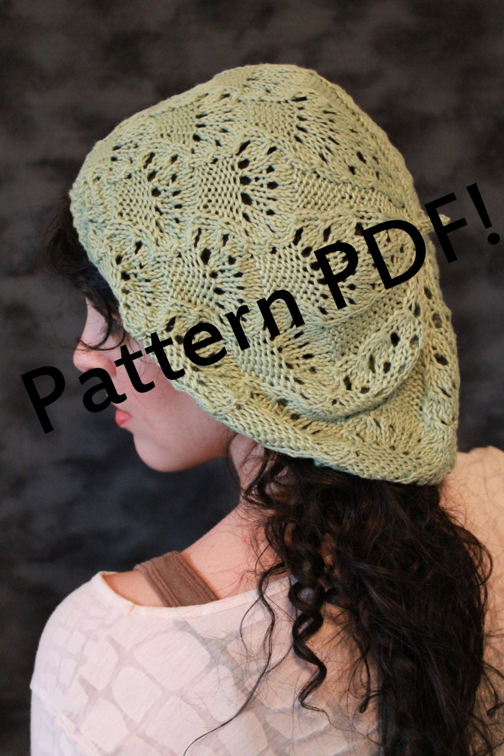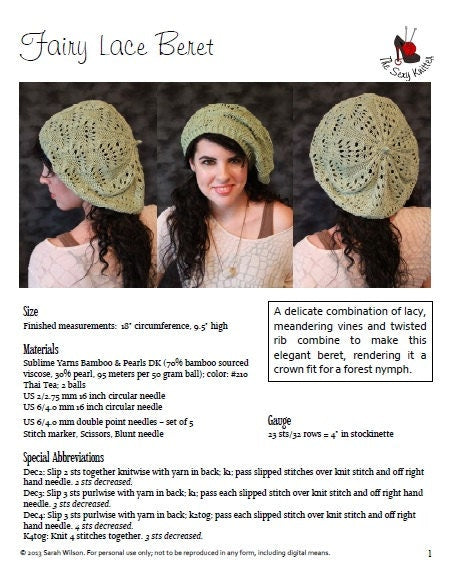A delicate combination of lacy, meandering vines and twisted rib combine to make this elegant beret, rendering it a crown fit for a forest nymph. The 2-page PDF includes both charts and written instructions for the lace.