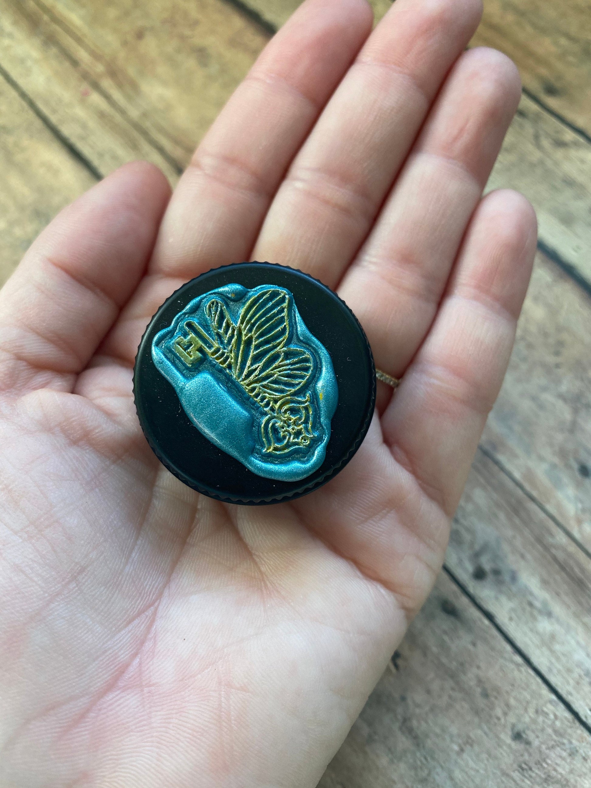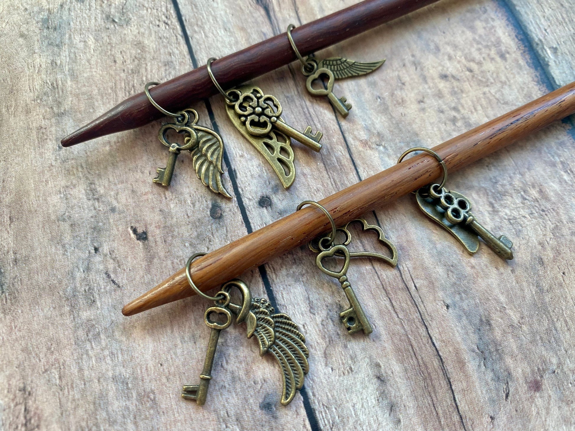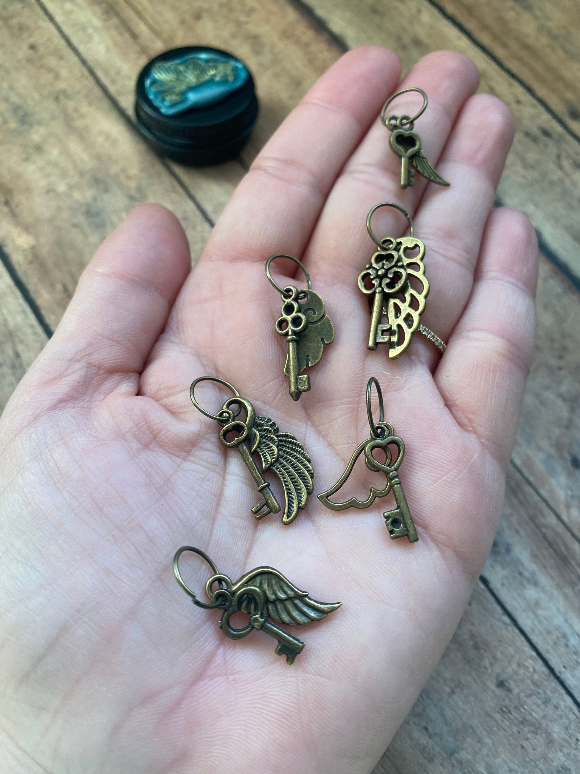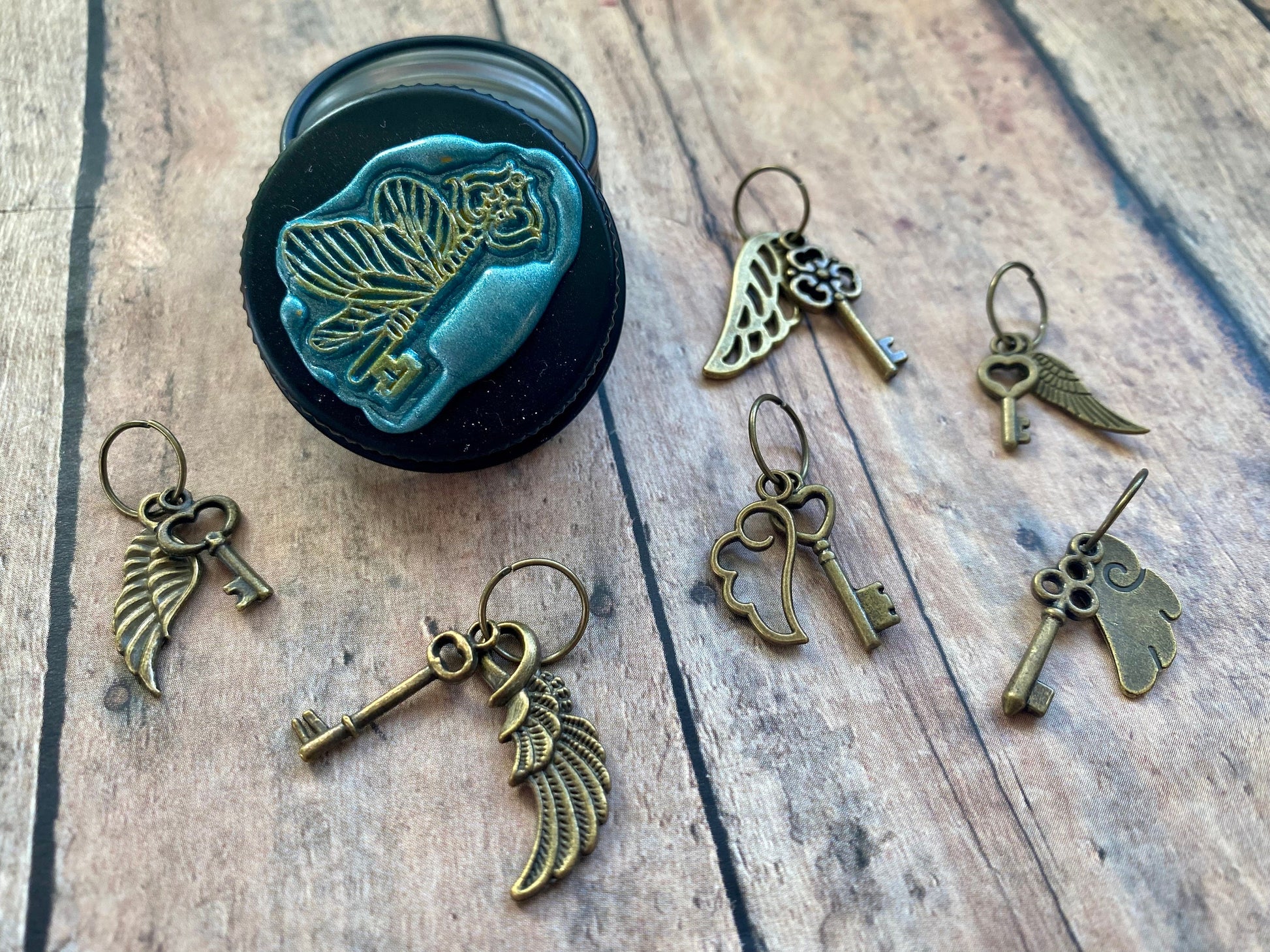 Alohamora! Join Harry Potter in his search for the winged key that will open the locked door. These adorable bronze charms have been handwired onto bronze jumprings sized to fit US 11/6 mm needles. Your set of 6 markers will arrive in a little tin that has been decorated with a shimmering teal wax seal embossed with a flying key, with details highlighted in gold. The tin measures 3.5 cm across and is 1.8 cm tall.
