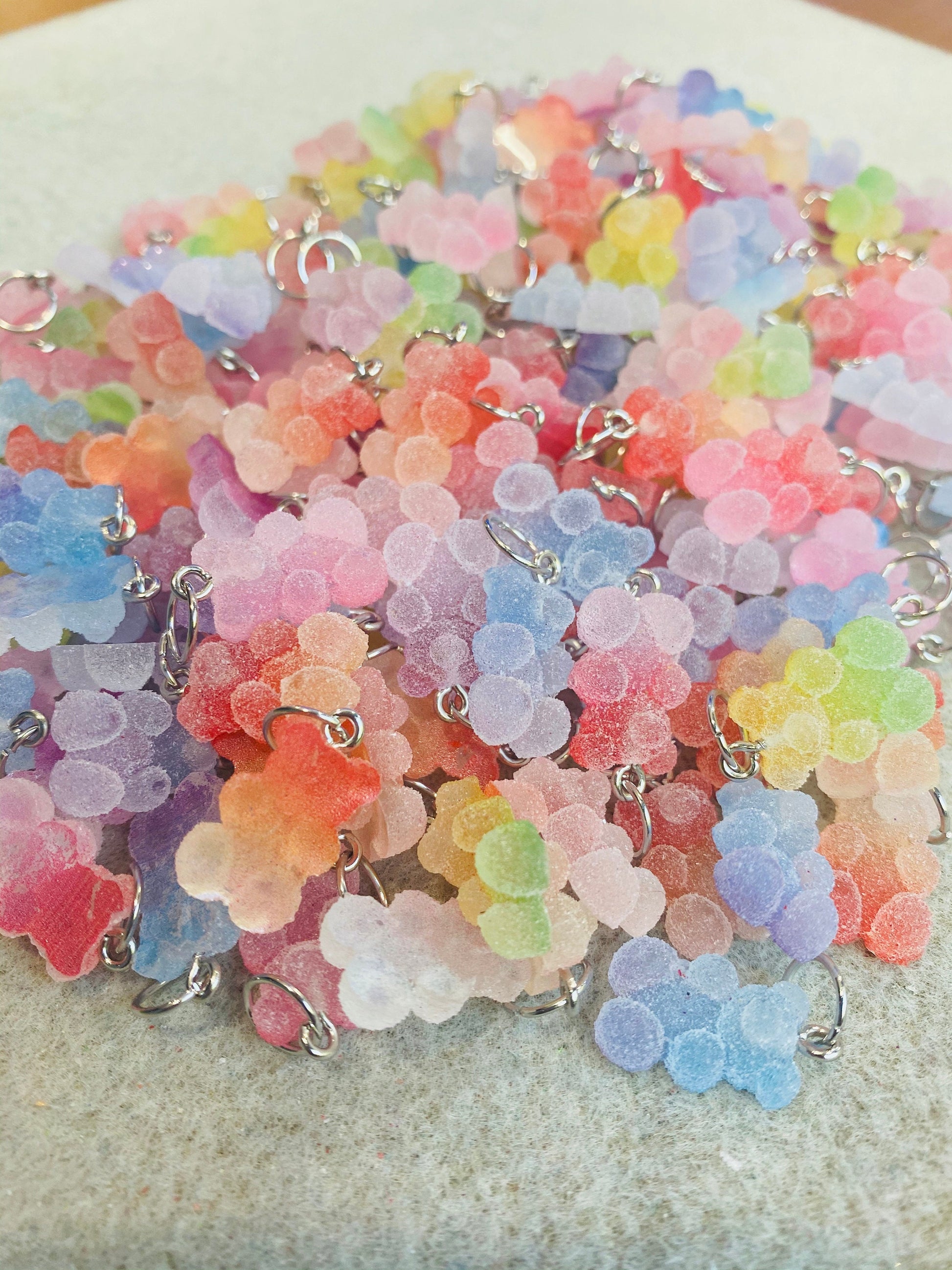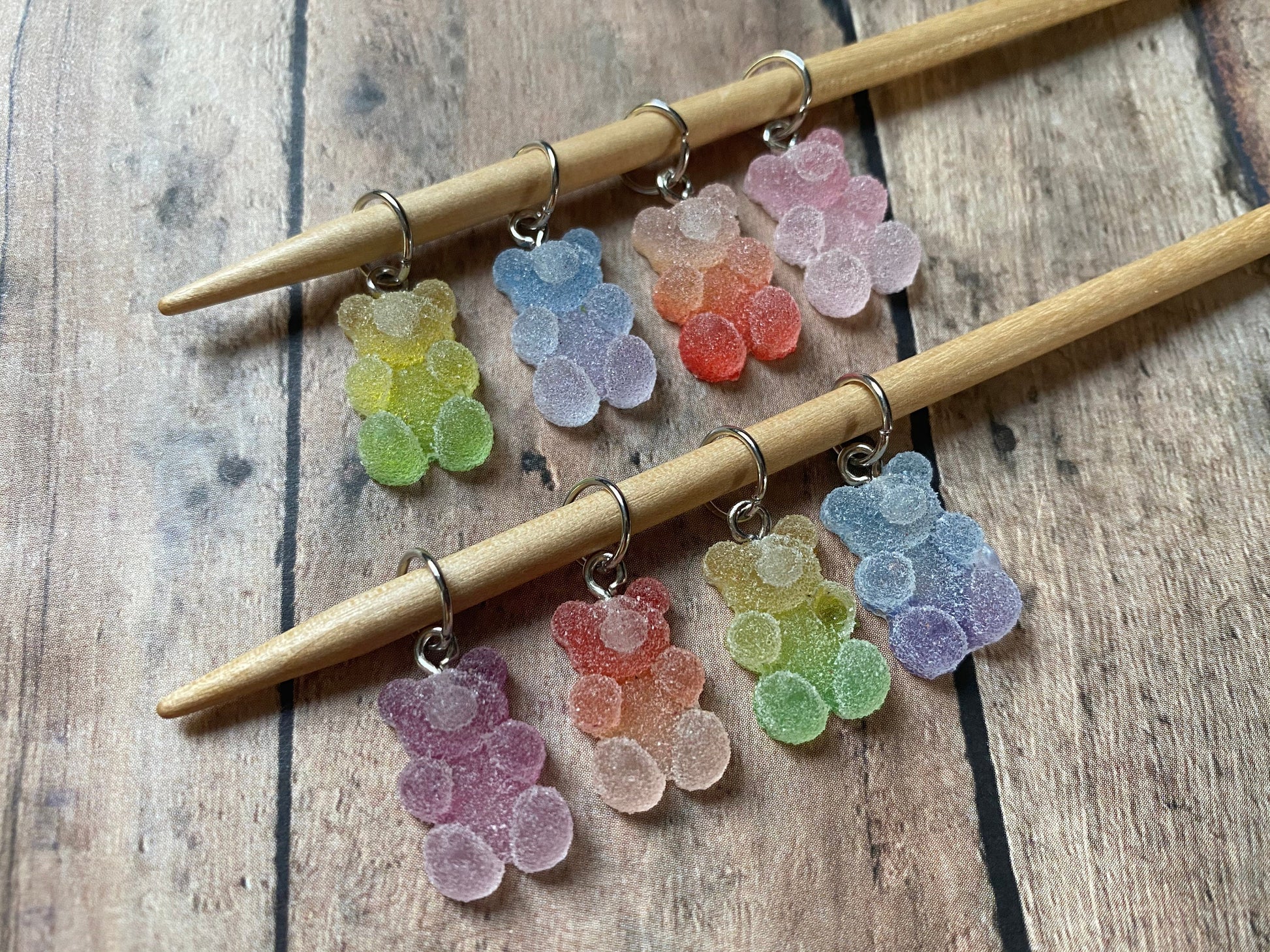 Gummy bears, anyone? This set of 8 stitch markers, perfectly recreated in lightweight, slightly squishy resin, has been finished with silver toned jumprings that will fit up to a US 9/5.5 mm needle. They look and feel just like real candy (don’t eat them, though)! They arrive in a thick, resealable plastic bag shaped like a tiny mason jar. The “jar” measures approximately 3” wide and 4” tall, and is printed with a copper “lid” on both sides. It’s clear in the middle so you can see your markers! You’ll receive a set of 10 mixed colors; photos show the large assortment available, the exact 10 you’ll receive will be a lovely surprise!