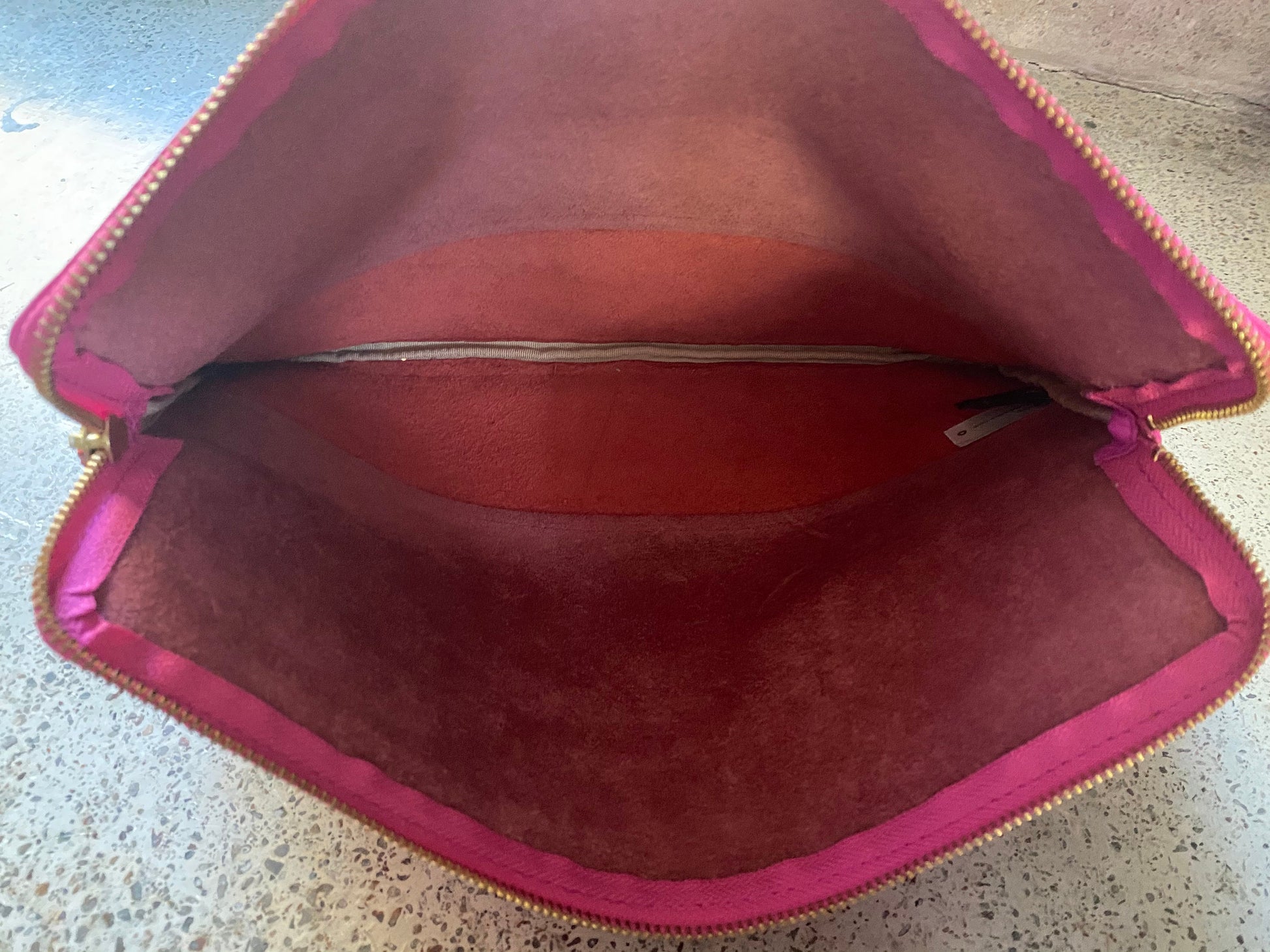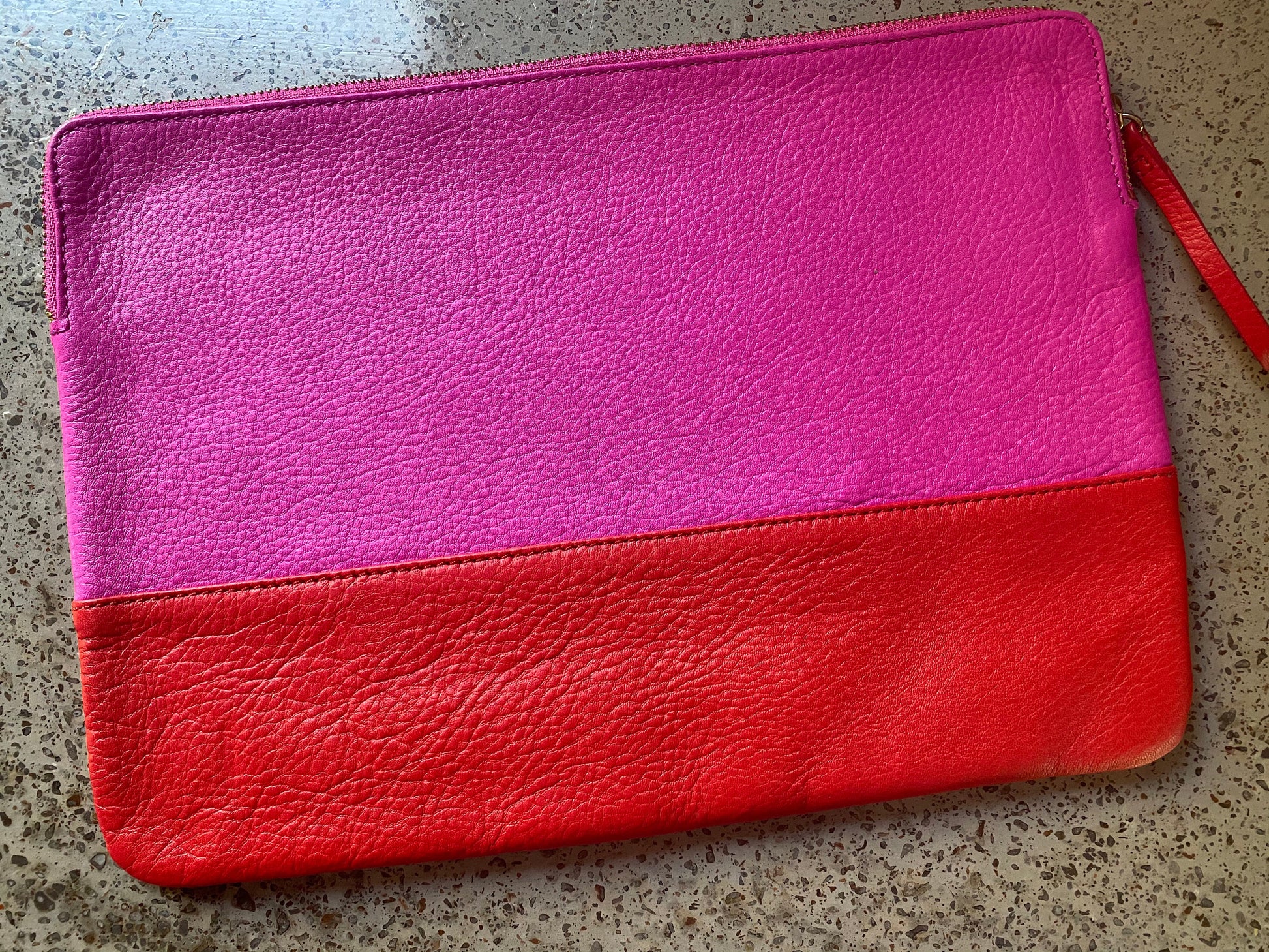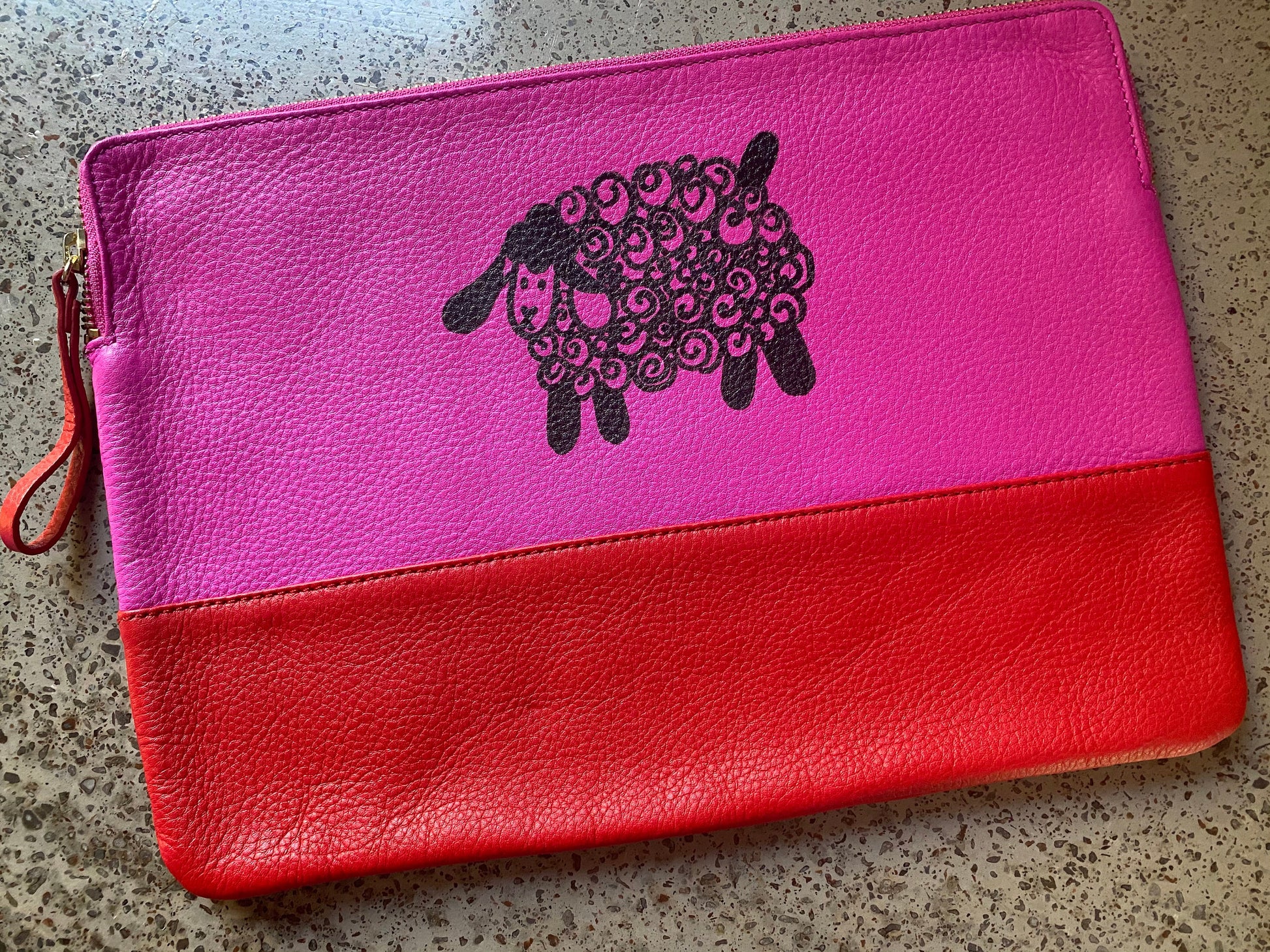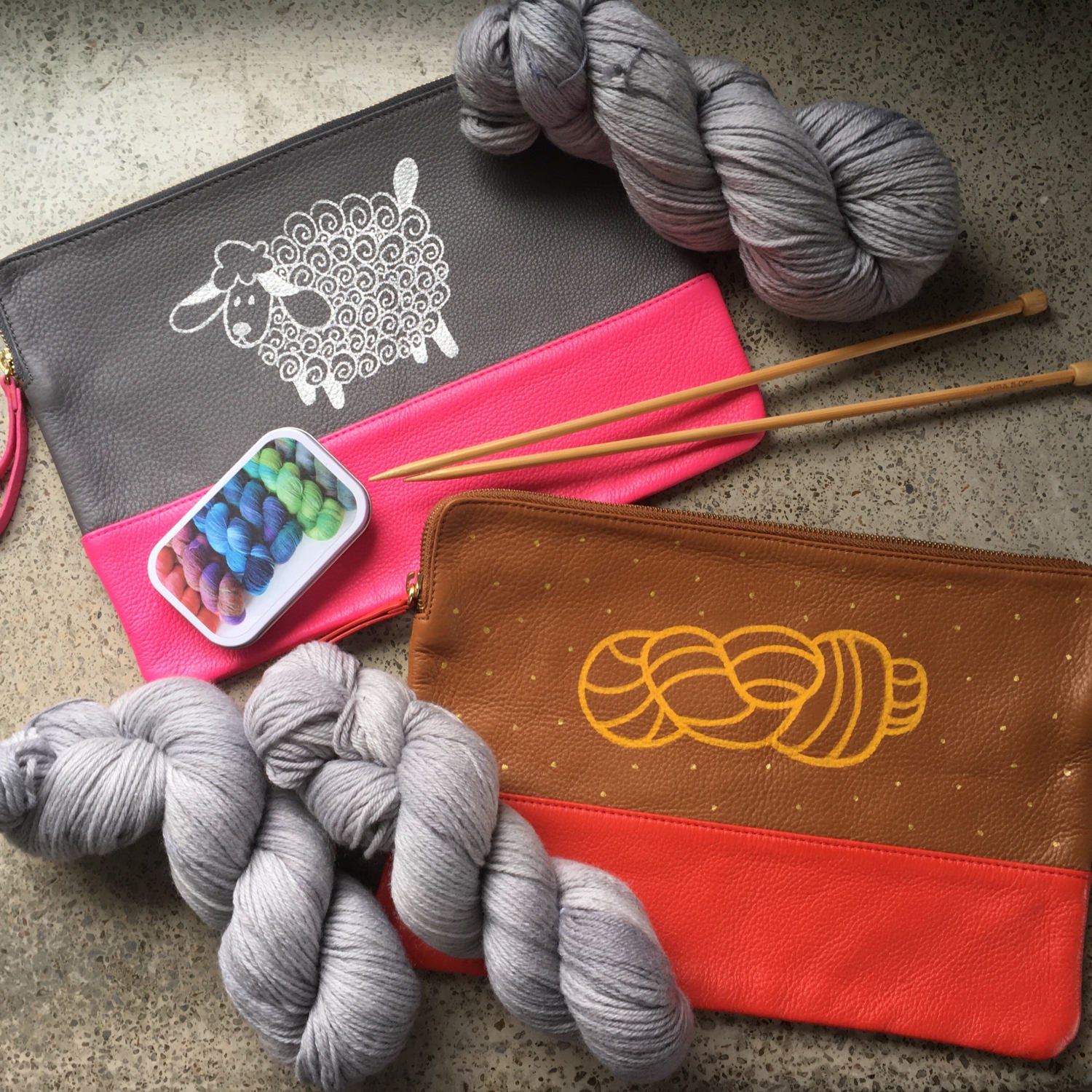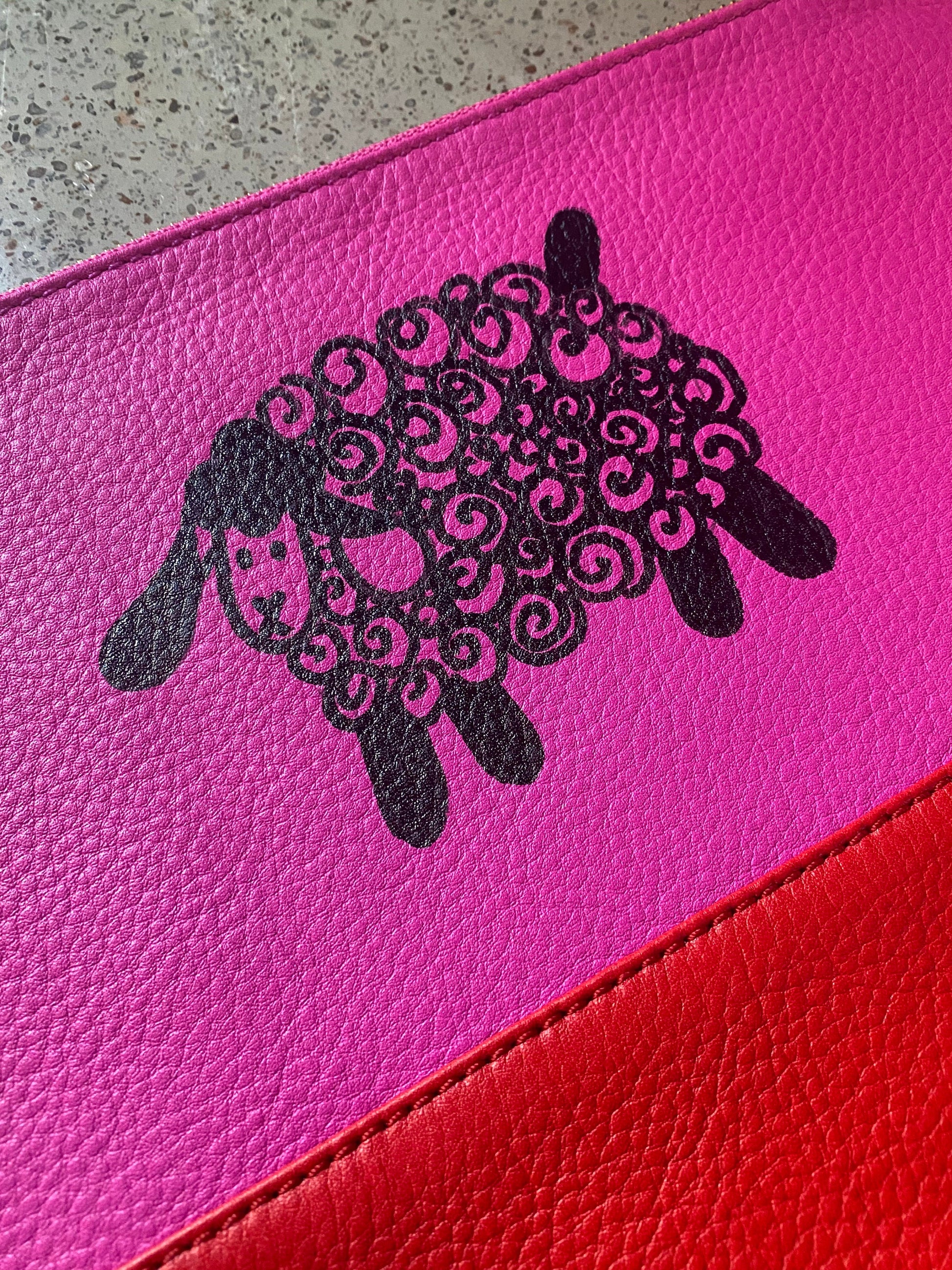 Perfect for small and medium sized projects like socks and shawls, this project bag has a large zippered compartment measuring 12" x 8". It is made of 100% genuine leather in bright pink and crimson red, and the front has been hand painted in black. The back side is plain.