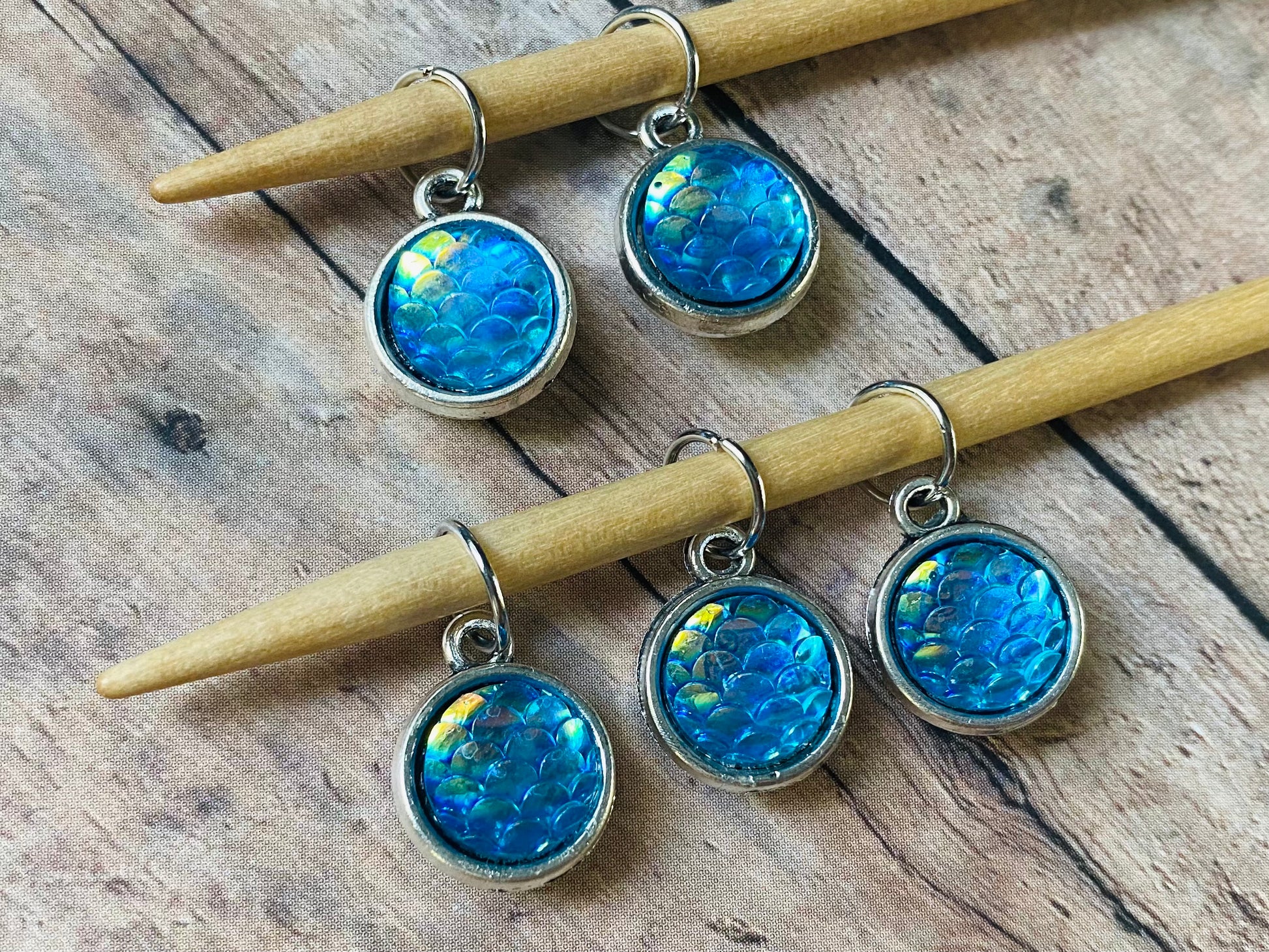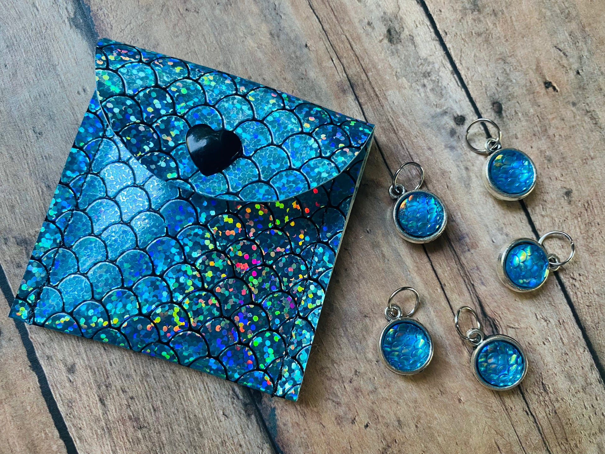SO. Sparkly!!!! You won’t believe your eyes when you see this in person…this holographic vinyl catches the light with every movement, sending sparkles in all directions! Inside you’ll find 5 coordinating, double sided mermaid scale stitch markers, hand wired onto silver toned jumprings that will fit up to a US 9/5.5 mm needle. The pouch measures approximately 2 1/2” square, and has a black, heart shaped snap closure.