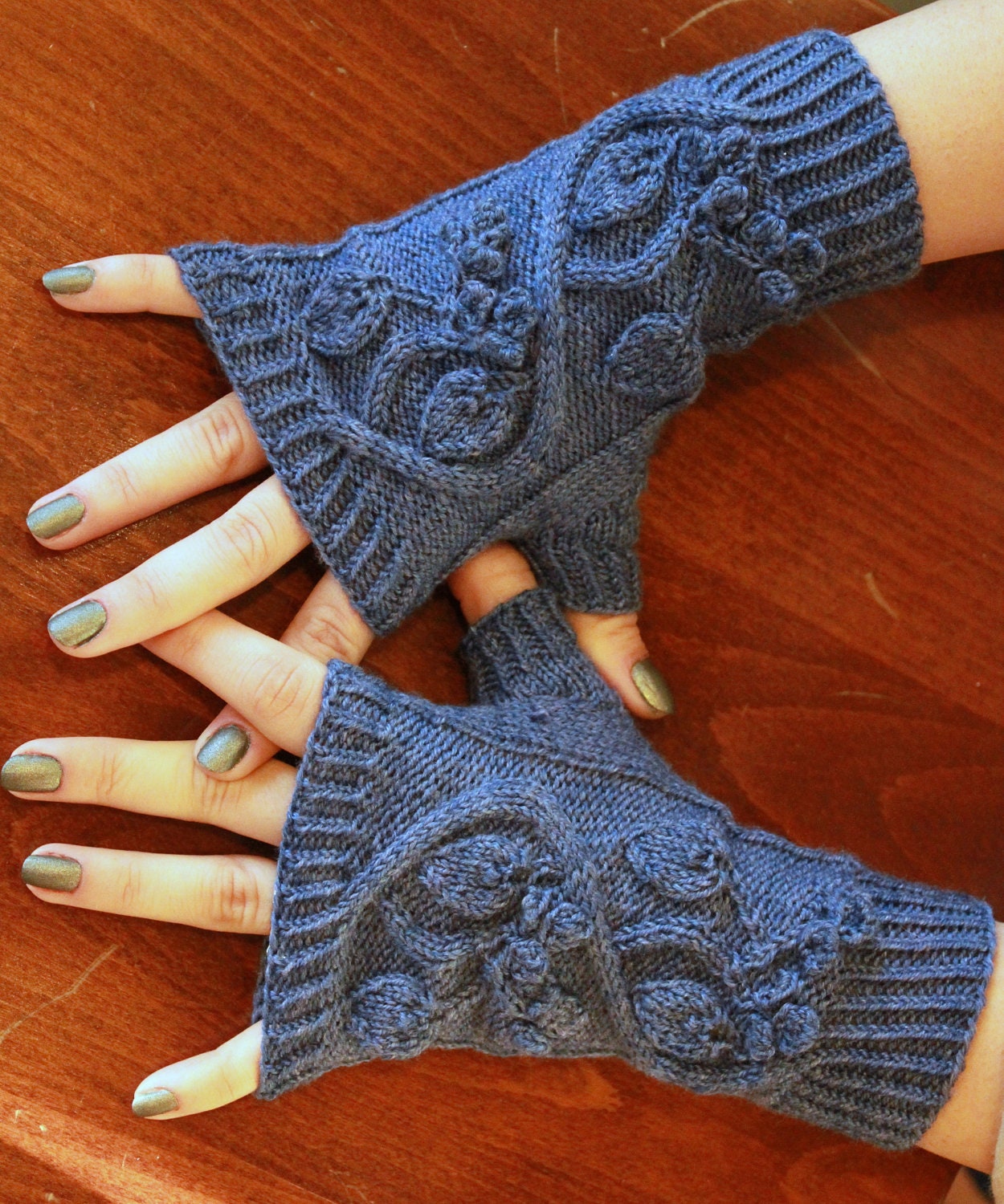 Inspired by the delicate leaves and berries of the Huckleberry plant, I wanted to create a mirrored pair of fingerless mittens that would highlight the plant’s features. I selected a meandering cable “vine” and added a few small bobble “berries”. Not a fan of working bobbles? There are only 12 on each mitt!