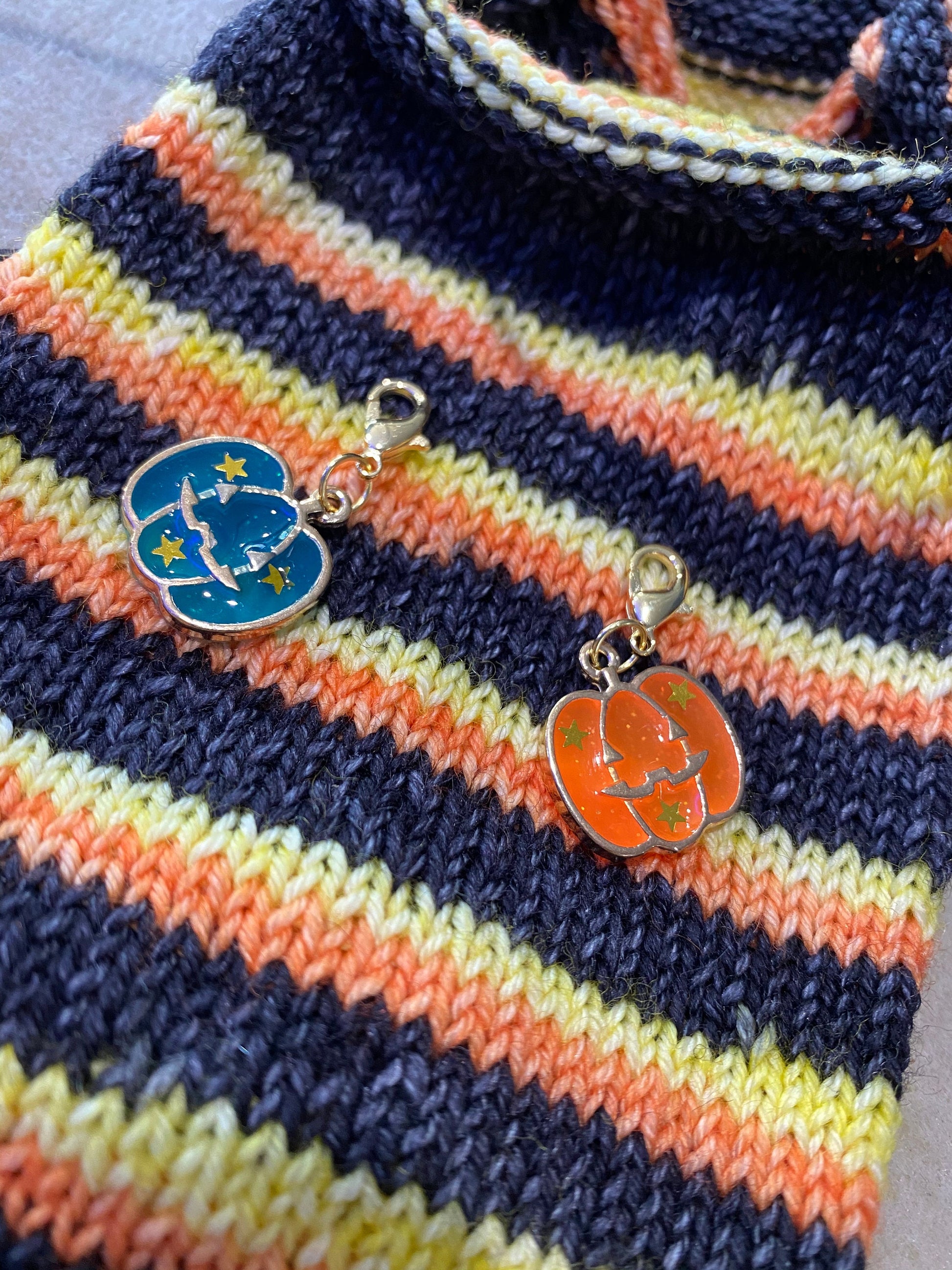 Pumpkin charms measure approximately 3/4” wide and 5/8” tall. Your purchase includes one each of the orange and teal pumpkins.