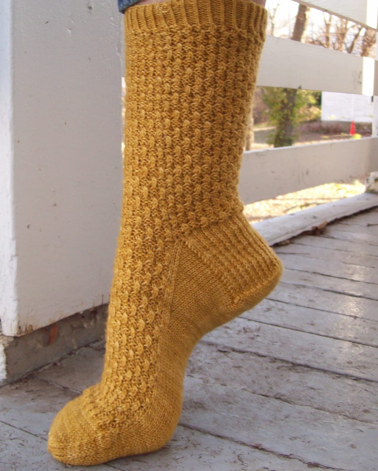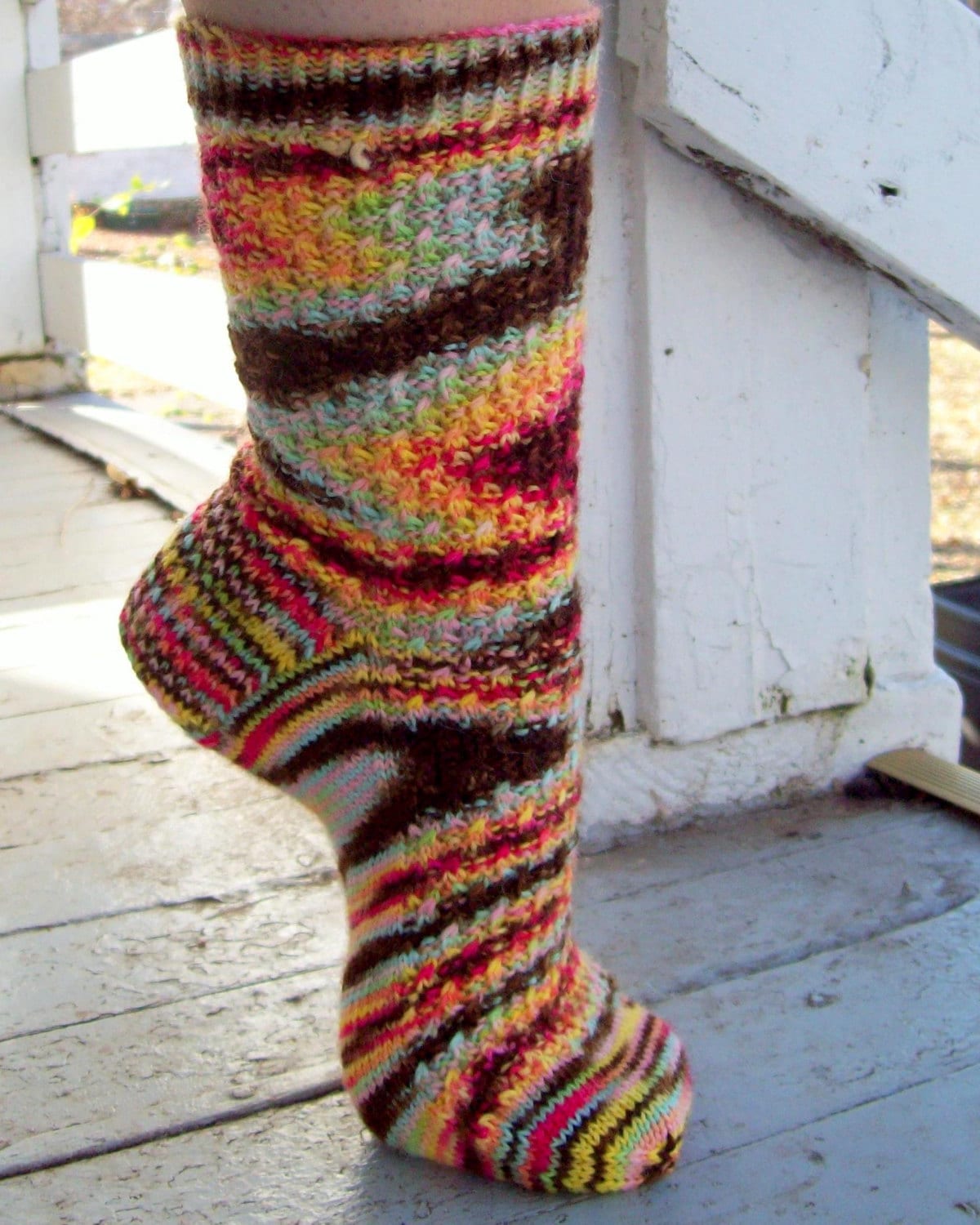This simple sock is a monster in disguise! Knit in a solid color, it’s as proper and demure as they come. But pull out a crazy variegated, and you’ll get something else entirely! Luckily, the allover texture of the stitch pattern can stand up to even the wildest of yarns, since the easy twist stitches help mesh the colors together.