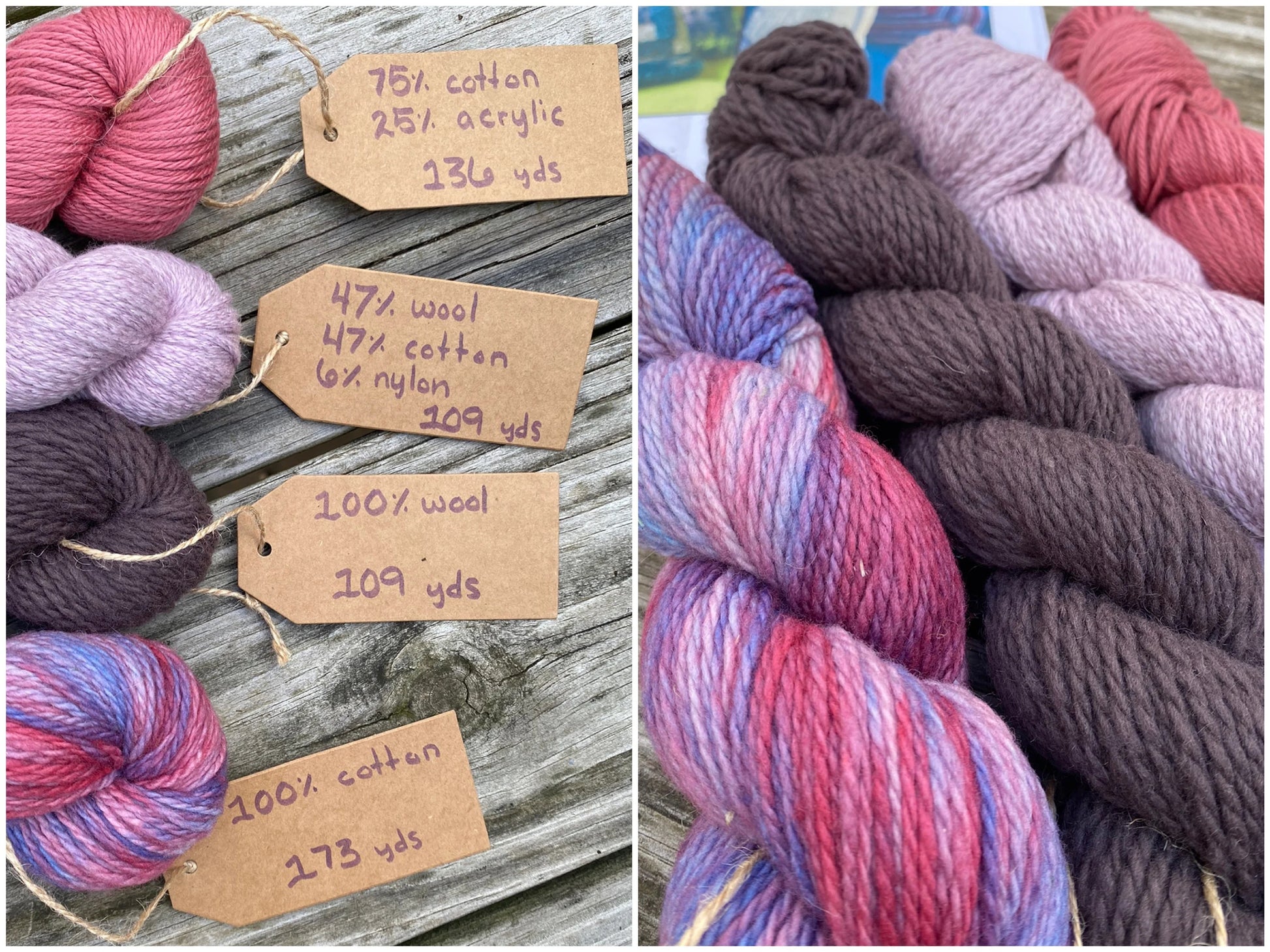 In this kit, you will receive 4 skeins of coordinated yarn of various weights, in shades of pink and purple, as well as a print copy of the pattern. Please see photos above for each skein’s individual yardage; the total yardage for this pack is 527 yards. This yarn pack is intended to create the front of your pillow cover; you will need additional yarn for the back and may or may not need additional yarn for the front of your pillow, depending on what size you choose to make. I approximate that this yarn pack will create a pillow front up to the 18” size. Please understand that because this is an any gauge, any texture pattern, yardage needs will vary from knitter to knitter.