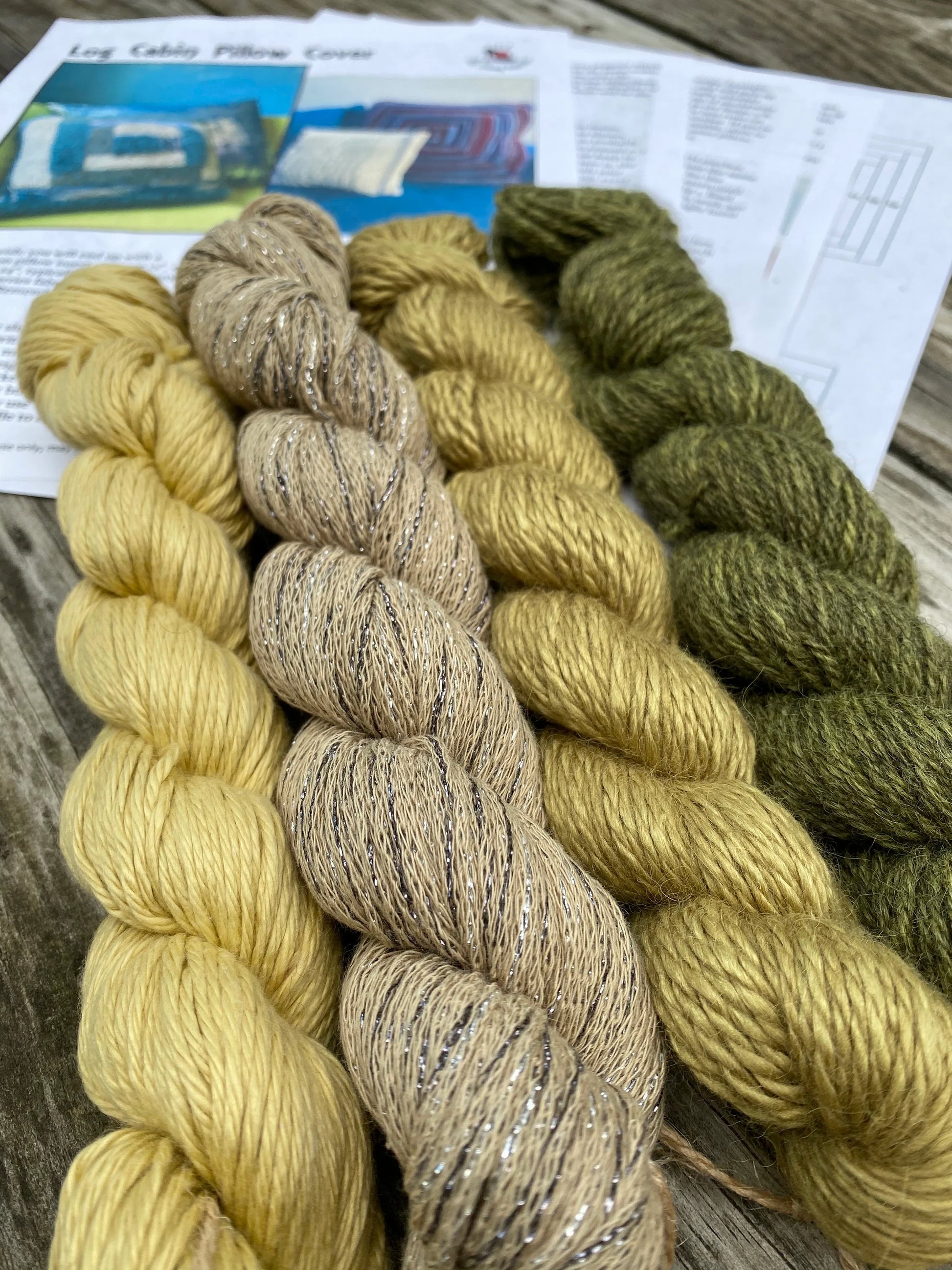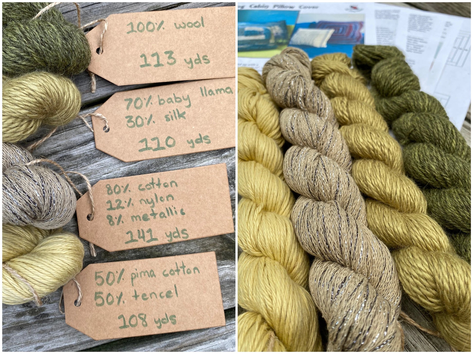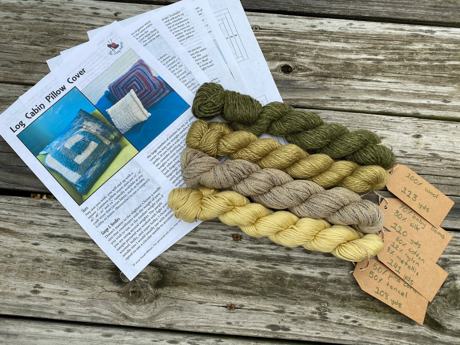 In this kit, you will receive 4 skeins of coordinated yarn of various weights, in shades of green and metallic, as well as a print copy of the pattern. Please see photos above for each skein’s individual yardage; the total yardage for this pack is 472 yards. This yarn pack is intended to create the front of your pillow cover; you will need additional yarn for the back and may or may not need additional yarn for the front of your pillow, depending on what size you choose to make. I approximate that this yarn pack will create a pillow front up to the 18” size. Please understand that because this is an any gauge, any texture pattern, yardage needs will vary from knitter to knitter.