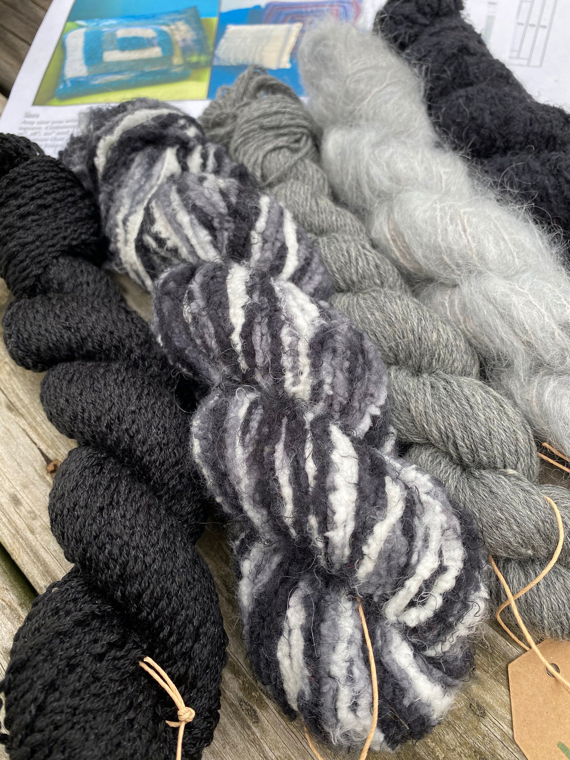 In this kit, you will receive 5 skeins of coordinated yarn of various weights, in shades of black, white and gray, as well as a print copy of the pattern. Please see photos above for each skein’s individual yardage; the total yardage for this pack is 576 yards. This yarn pack is intended to create the front of your pillow cover; you will need additional yarn for the back and may or may not need additional yarn for the front of your pillow, depending on what size you choose to make. I approximate that this yarn pack will create a pillow front up to the 20” size. Please understand that because this is an any gauge, any texture pattern, yardage needs will vary from knitter to knitter.