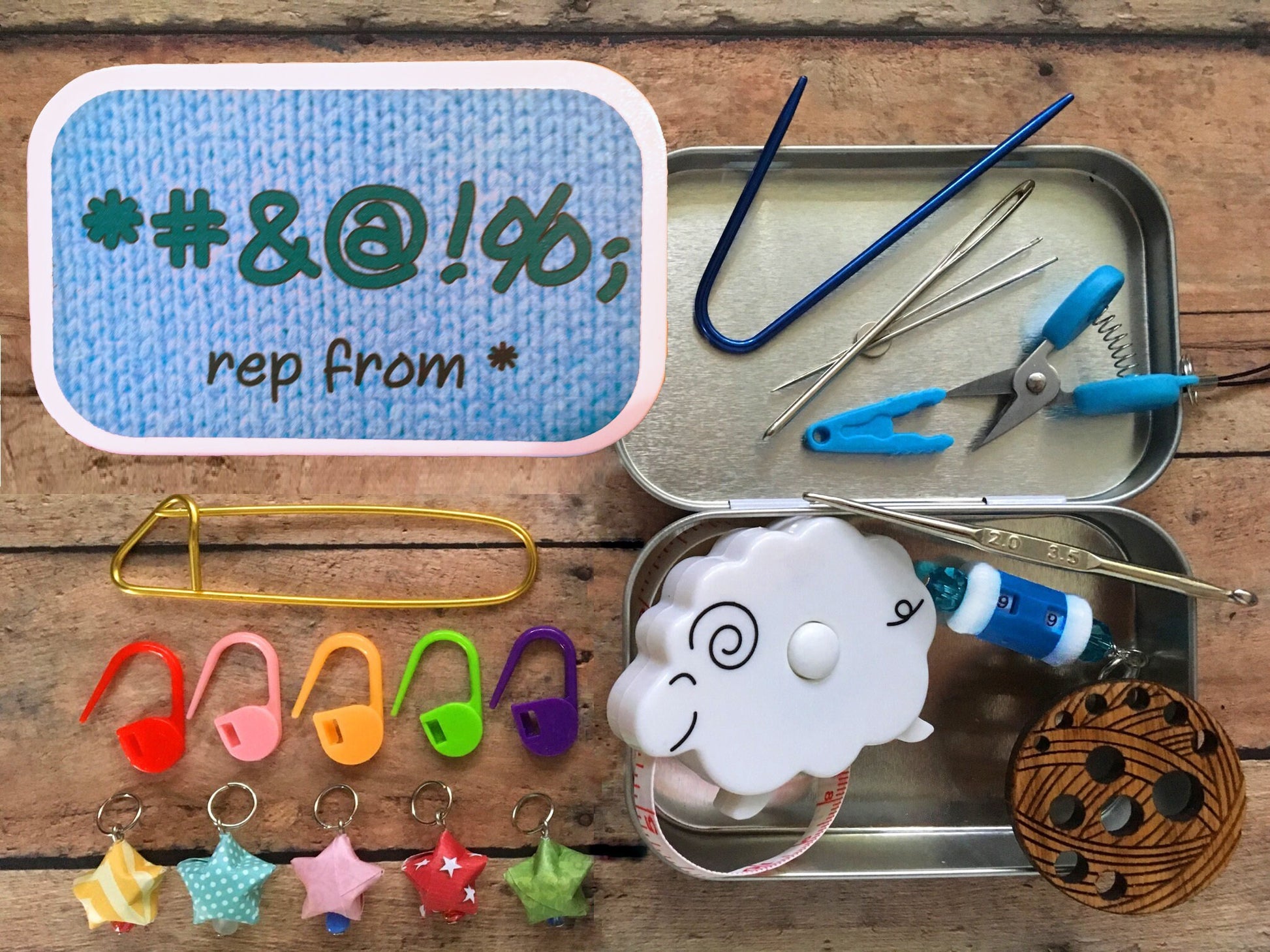 Colors of scissors, measuring tape and stitch markers vary with each tin and may not be the same as pictured. If you have a specific color preference for these items, please leave me a note during checkout, and I will be happy to accommodate you.