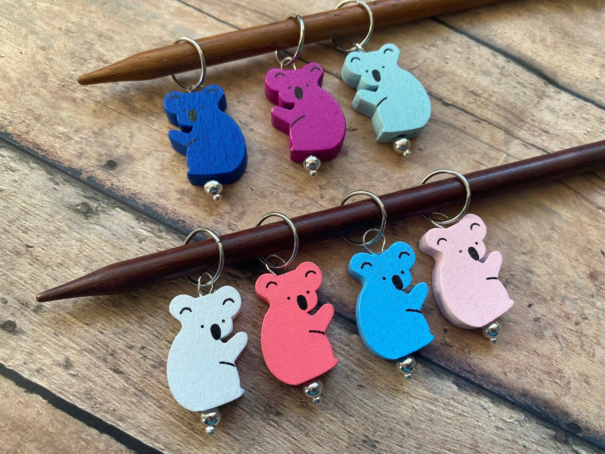 This cute vinyl pouch is scattered with blue and pink tropical leaves! Inside you’ll find a colony of 7 koalas in a range of blues, pinks, and coral. Each marker has been hand wired onto silver jumprings that will fit up to a US 13/9 mm needle. The pouch measures approximately 2 3/4” long and 2” tall, and has a blue snap closure. These pouches were cut and assembled by hand, and each one will feature the print in a little bit different spot - that just makes them each unique!