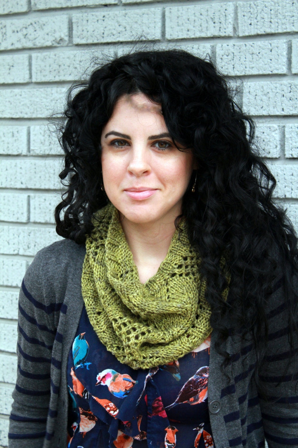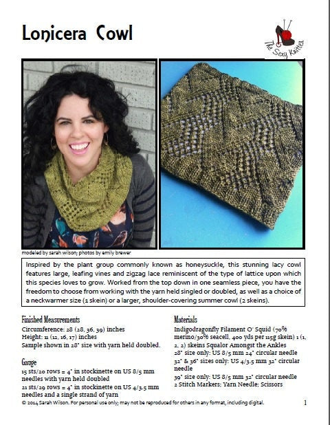 Inspired by the plant group commonly known as honeysuckle, this stunning lacy cowl features large, leafing vines and zigzag lace reminiscent of the type of lattice upon which this species loves to grow. Worked from the top down in one seamless piece, you have the freedom to choose from working with the yarn held singled or doubled, as well as a choice of a neckwarmer size (1 skein) or a larger, shoulder-covering summer cowl (2 skeins).