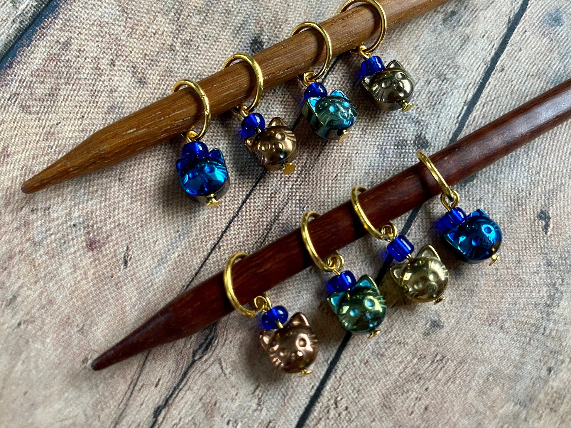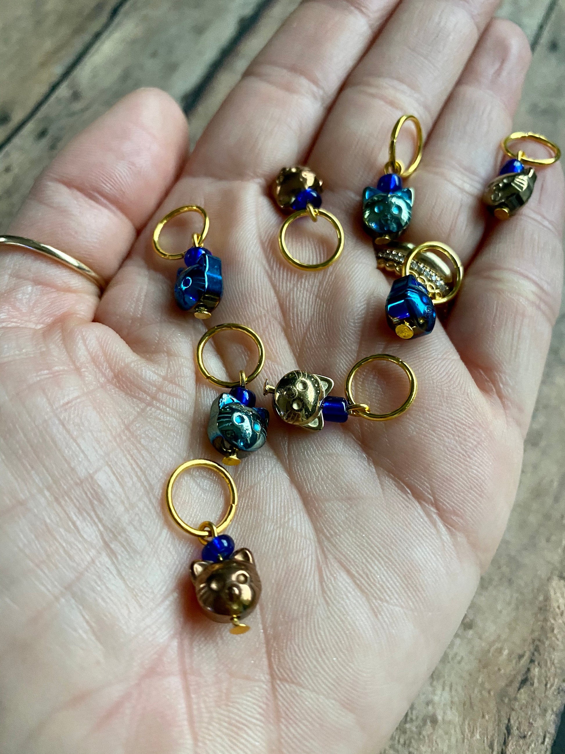 Sparkle kitties, anyone? You won’t be able to miss these stitch markers in your work due to all the BLING! I’ve paired each shimmering, metallic kitten with a small blue glass bead, then hand wired them onto gold toned jumprings that will fit up to a US 9/5.5 mm needle. You will receive 2 each of gold, bronze, green and blue cats.
