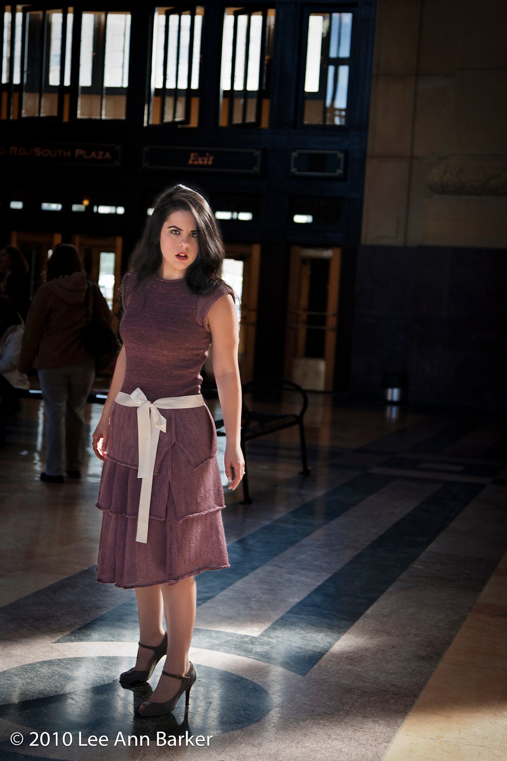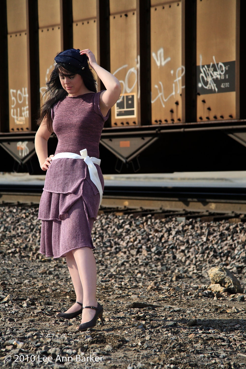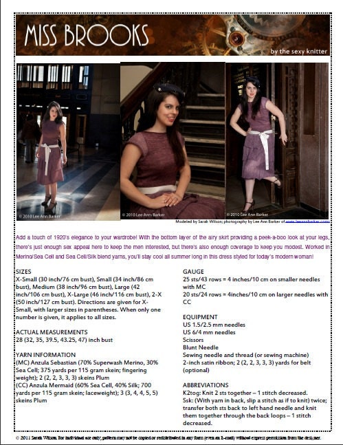 This dress relies entirely upon the beauty of stockinette to make its bold statement. Constructed in layers, the skirt provides a bit of a peek-a-boo effect through the bottom layer, while the top two layers cover you where it matters. A slim fitting top and lacy cap sleeves finish this 1920’s-inspired frock off in style!