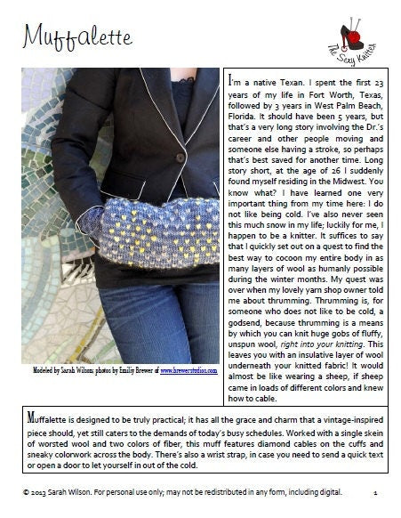 Inspired by a Southerner’s desire to keep as warm as possible during the winter months, this thrummed muff features diamond patterning across the body, intricately cabled cuffs, and a wrist strap to keep it handy. The 5-page PDF includes a link to a video tutorial for making thrums and inserting them into your knitting, as well as stitch-by-stitch written instructions and charts for the colorwork and cabled sections.