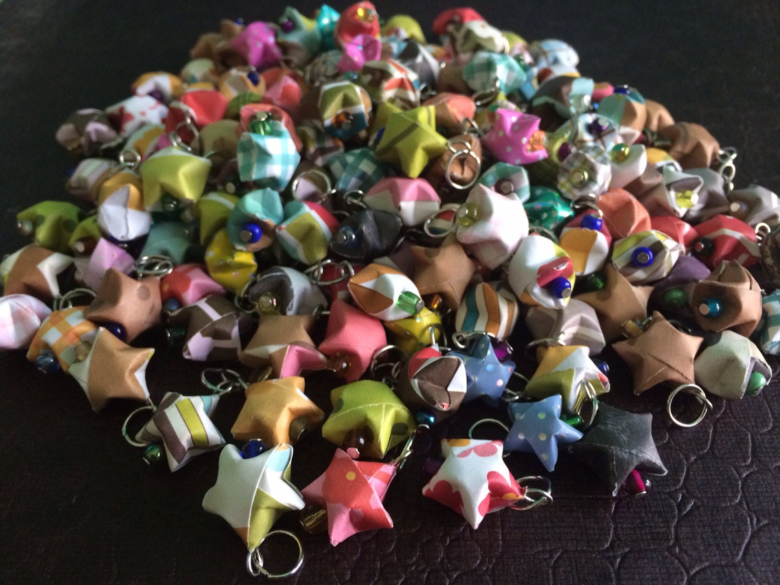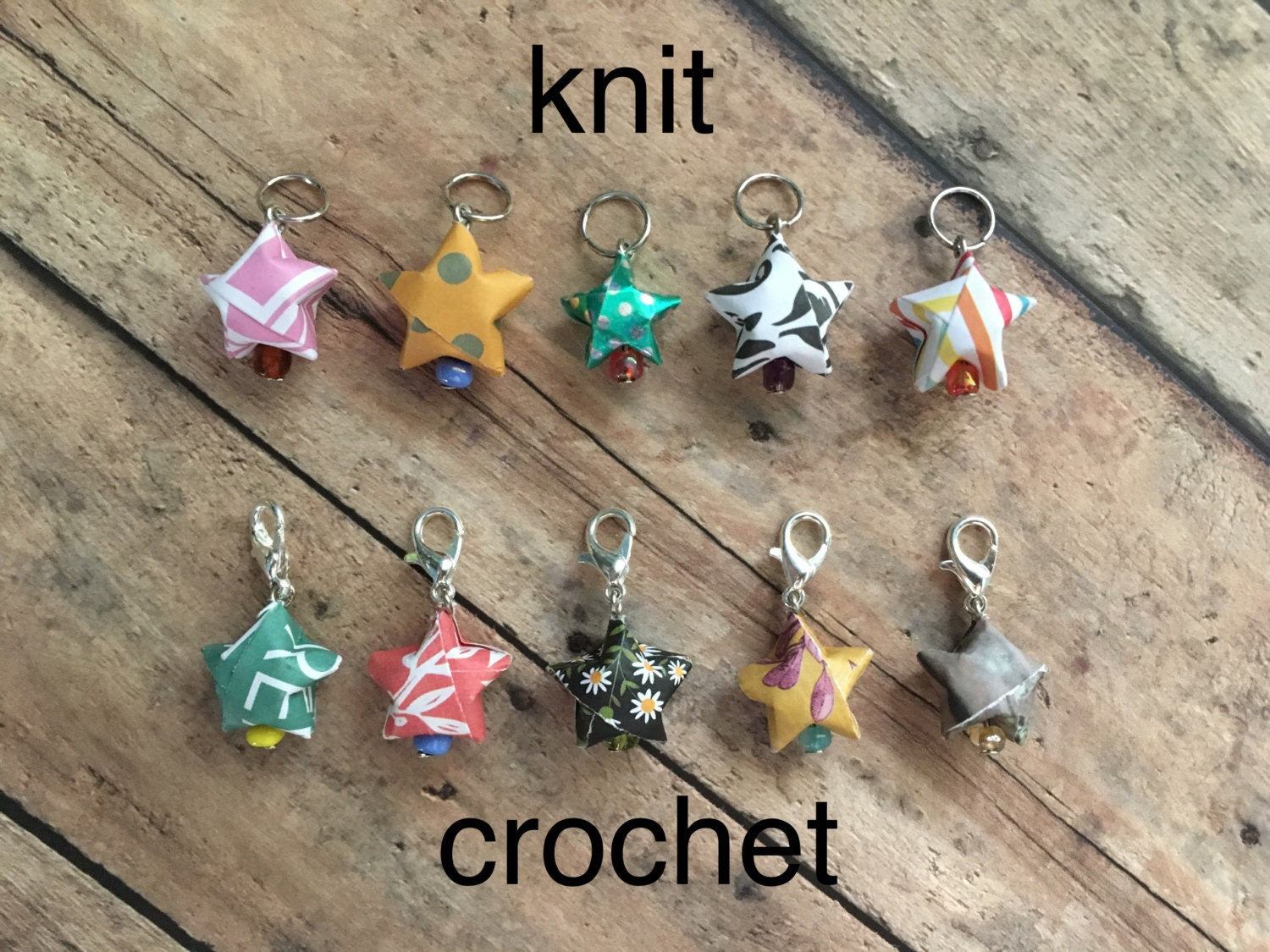 A Sexy Knitter original! This set of 5 stitch markers is handmade from brightly colored, folded paper stars and wired onto silver jeweler's wire with large glass seed beads. These are surprisingly durable - I even had a customer tell me one survived going through the wash!