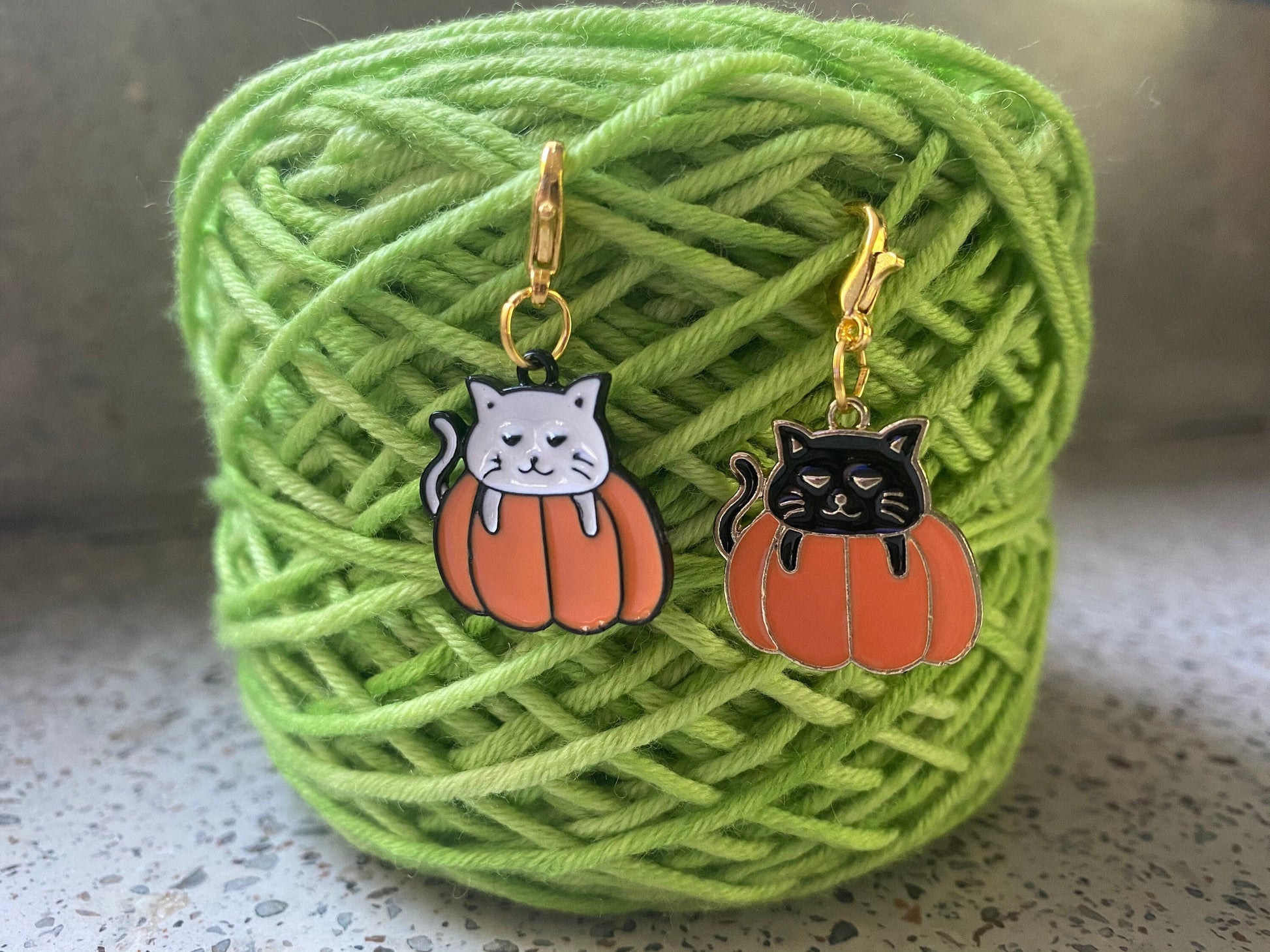 These kitties are more cute than they are spooky! The bright, enamel charms have been handwired onto golden lobster clasps for keeping track of your progress while knitting or crocheting. They would even be cute as zipper pulls!