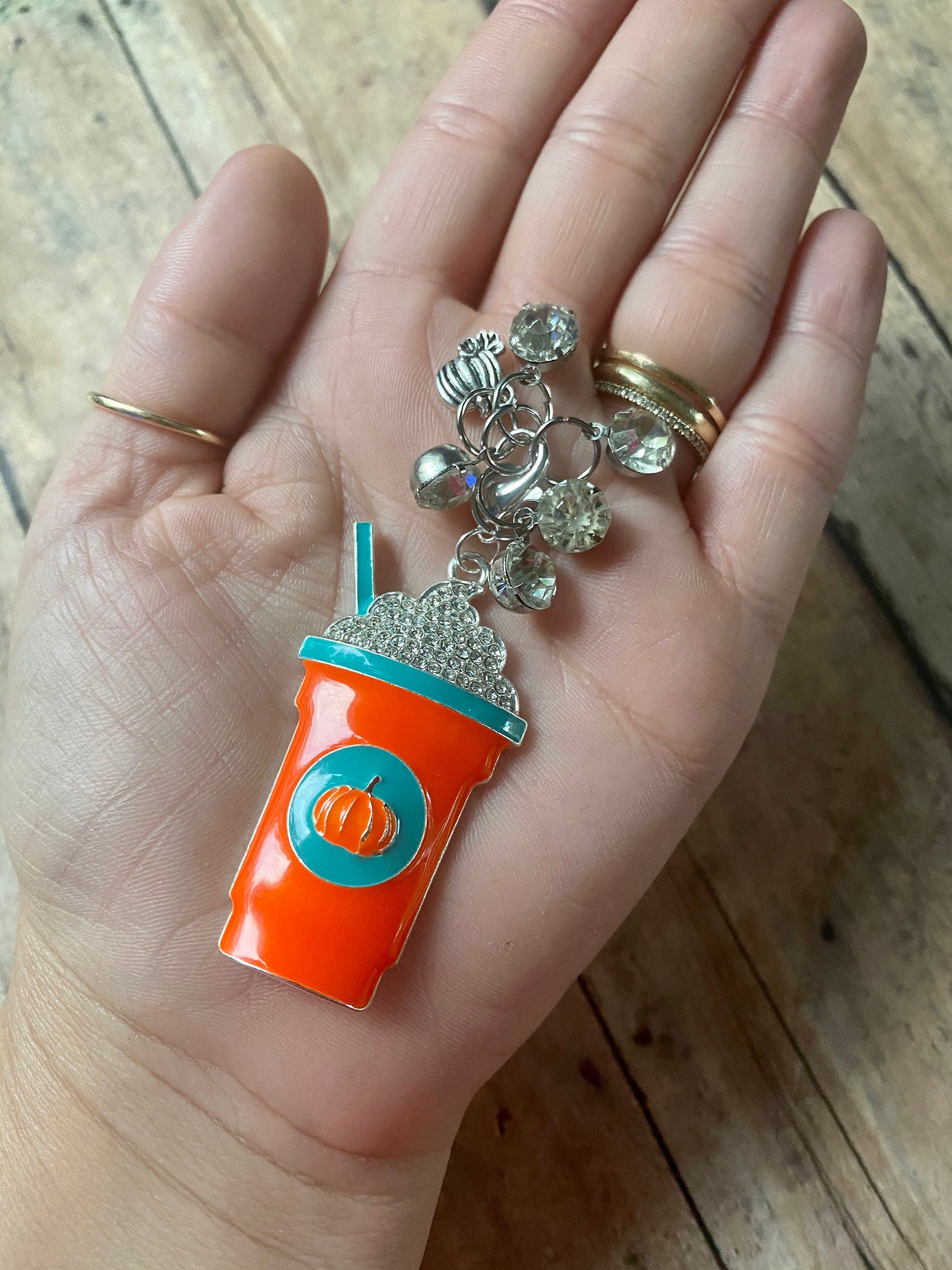 Pumpkin Spice Latte & glittering rhinestones? Yes, please! This bright, enamel cup is studded with rhinestone “whipped cream” and sports a pumpkin motif. It acts as a holder for a set of 5 shimmering crystal markers and 1 silver pumpkin marker, each sized to fit up to a US 8/5mm needle. Toss it in your knitting bag and your markers will be super easy to find!