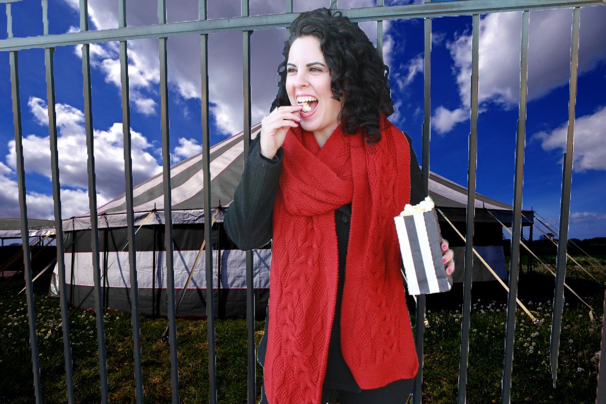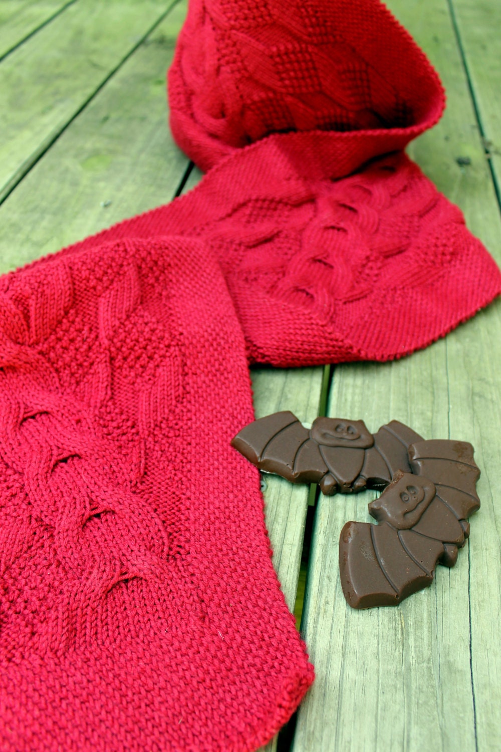 Erin Morgenstern’s The Night Circus provided excellent inspiration for this scarf. In this wonderfully imaginative book, lovers of a magical circus travel around the world, following the excitement. Many identify themselves to each other by dressing all in black whilst visiting the circus, accessorizing with a single, scarlet accent. One girl knits the hero a warm woolen scarf to help induct him into the group known as the “Reveurs” (or, “Dreamers”). Here, I’ve dreamt up my own vision of what that scarf would look like: A wide, reversible cable meanders over a stunning patterned background, while the edging takes on a slightly tilted look thanks to tiny reversible cables. I wanted the overall effect to be magical, as though it were almost impossible; however, the knitting itself is quite simple! Each row begins and ends with simple, 1x1 cables. There is just one increase and decrease on each right side row, and the rest is knits and purls. You’ll cable the largest cable just once every 12th row, and every wrong side row is worked plain.