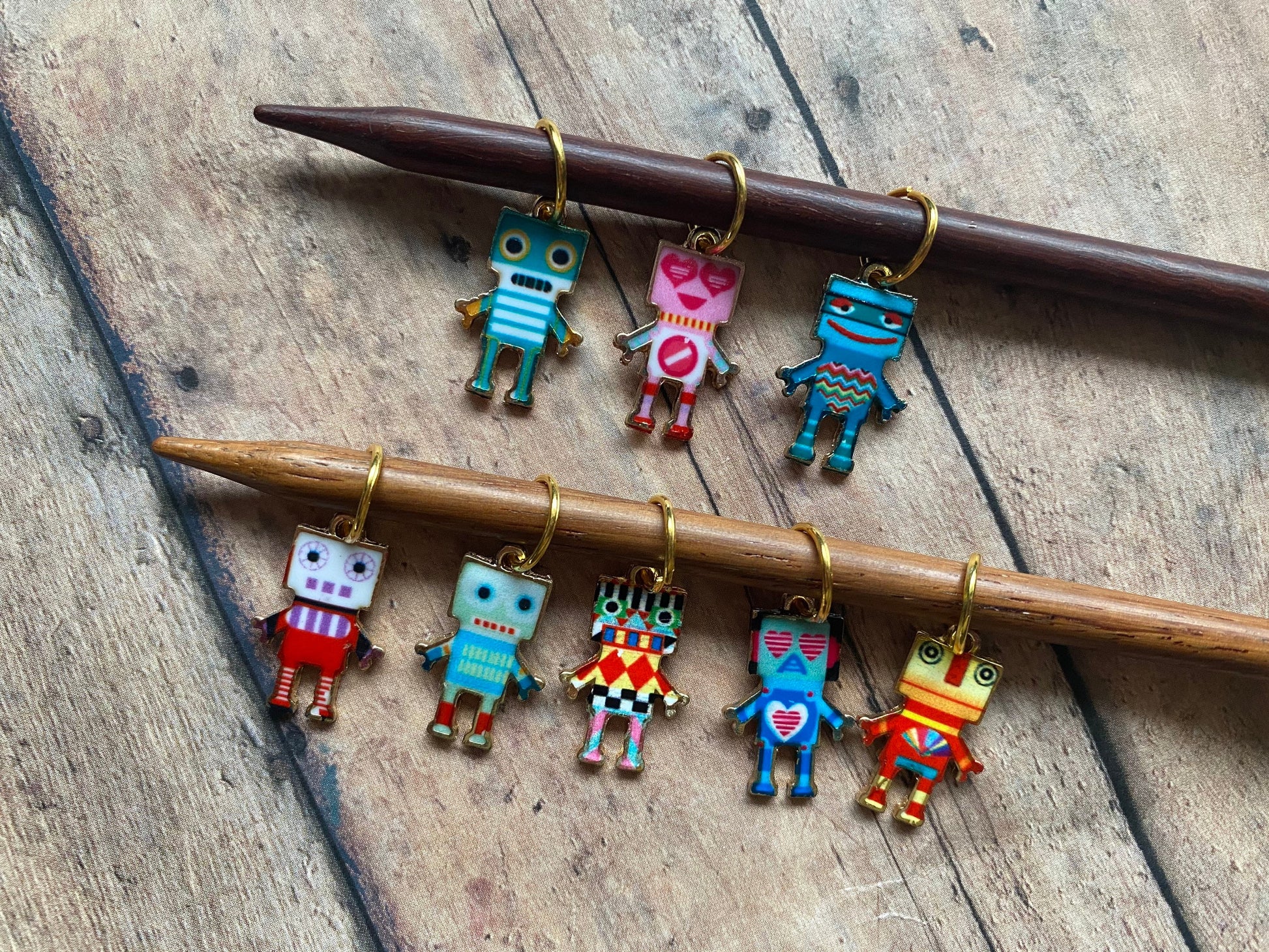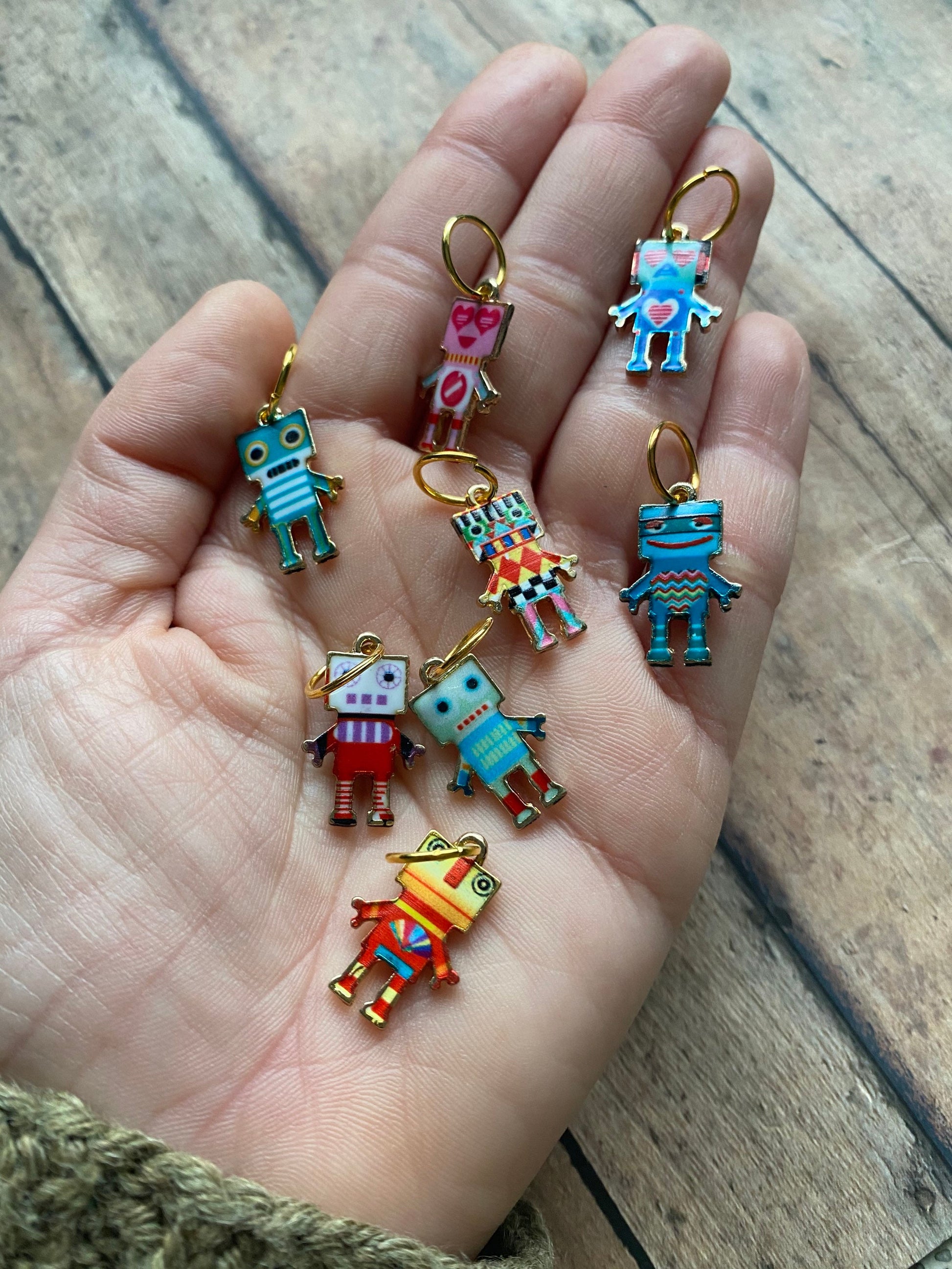 Beep boop beep! The futurism of the 1950s is here in all its glory, in this set of 8 stitch markers made from brightly colored enamel charms. This set of unique robots has been finished with gold toned jumprings that will fit up to a US 10/6 mm needle. Perfectly lightweight, snag free markers to add a bright pop of color to your knitting projects!