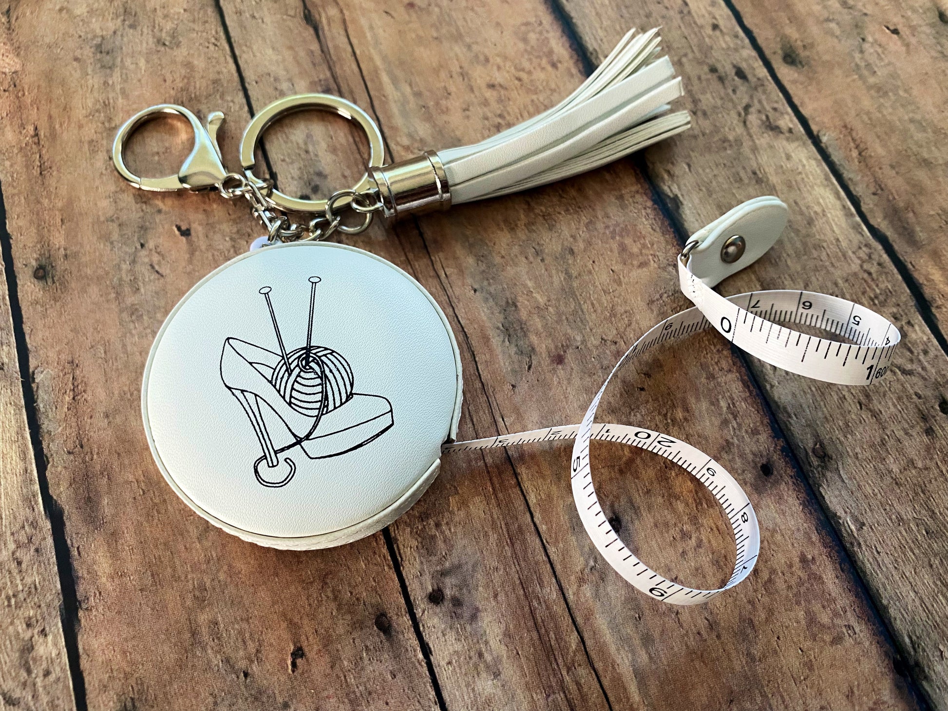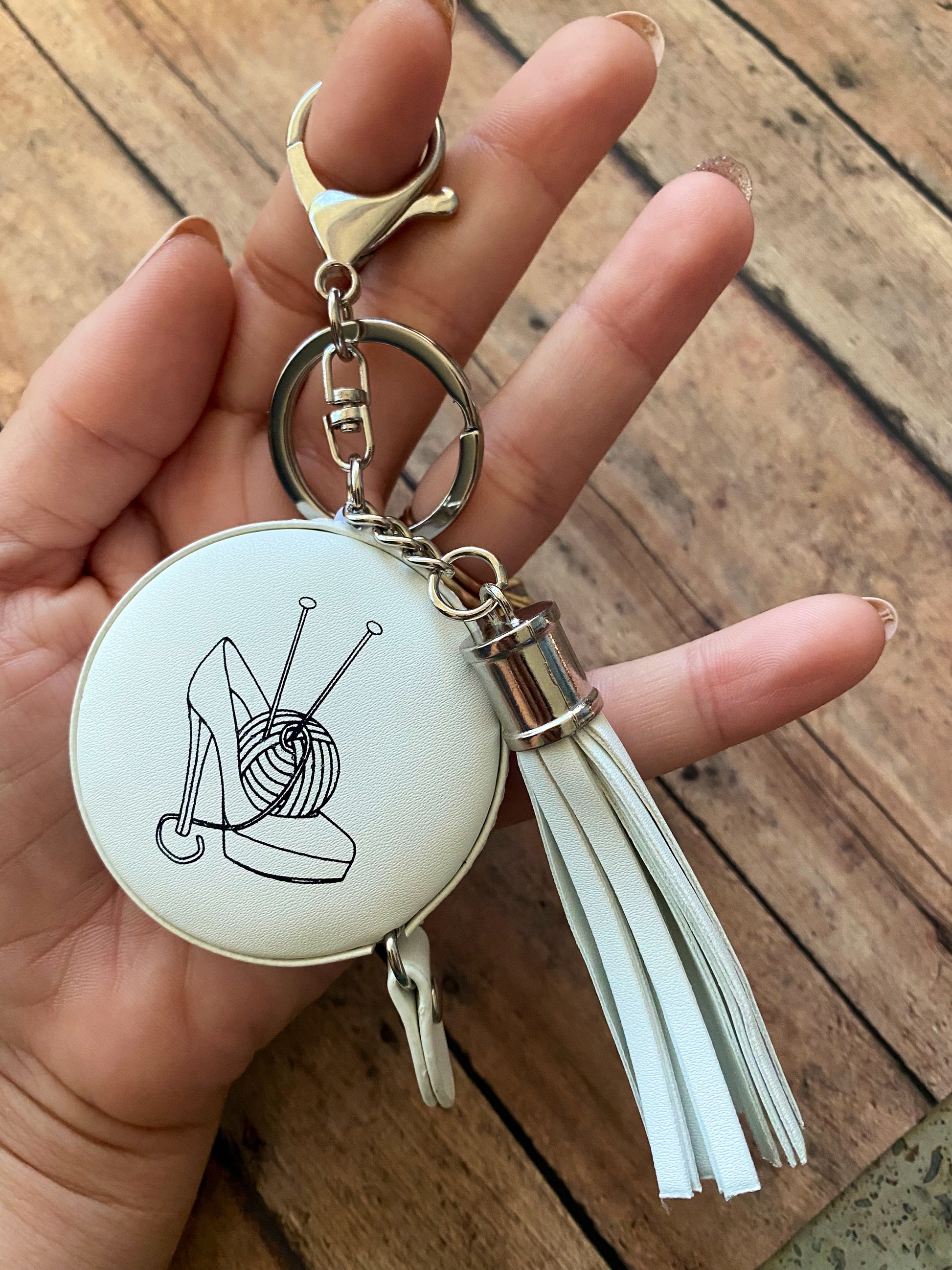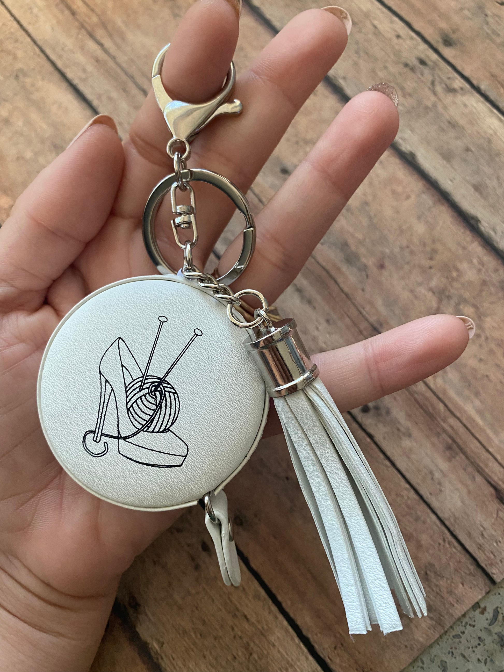 Sexy Knitter tape measures are here! My chic logo is outlined in black against a pure white leather background, and affixed with a keychain, tassel, and lobster clasp for hanging. Clip it to your bag and it’ll always be handy!