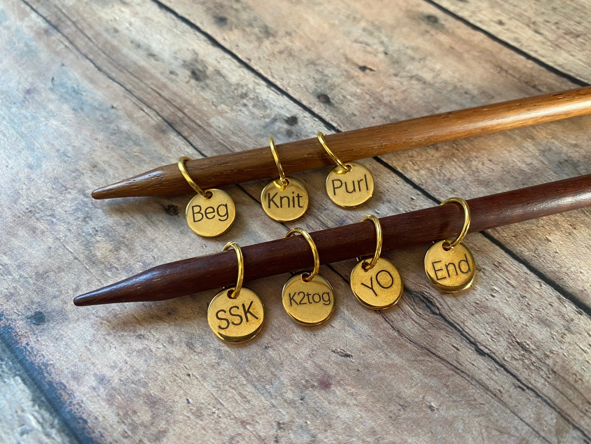 Never lose track of your pattern again with this clever set of 7 markers, sized to fit up to a US 10.5/6.5 mm needle. These metal charms have been etched with helpful, common knitting abbreviations which can be used to indicate exactly what you’re meant to do at each marker! You will receive one each of: Knit, Purl, Beg, End, YO, K2tog, and SSK.