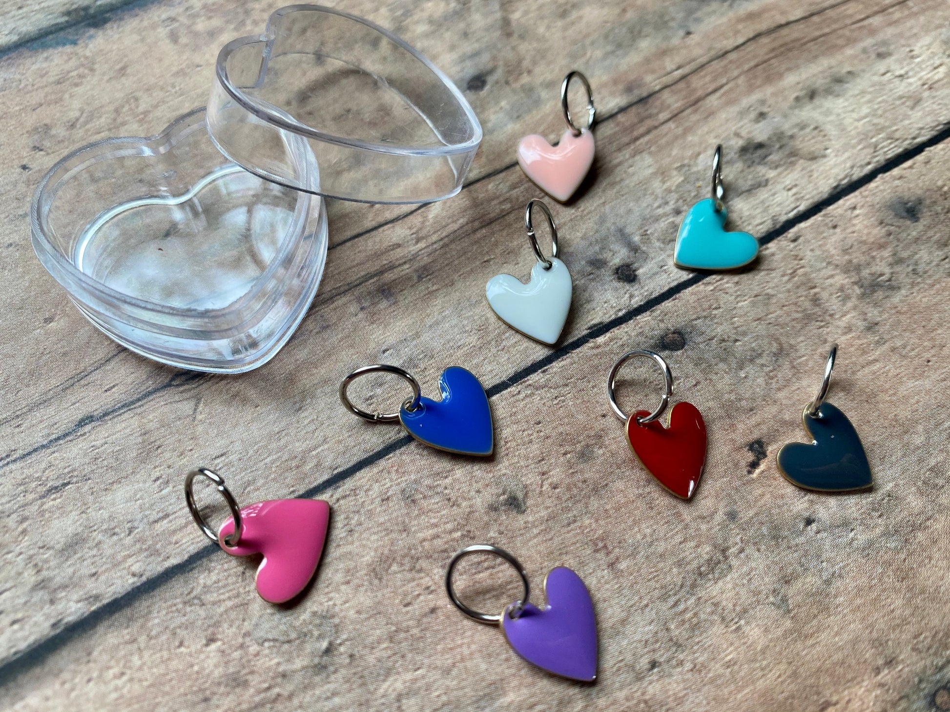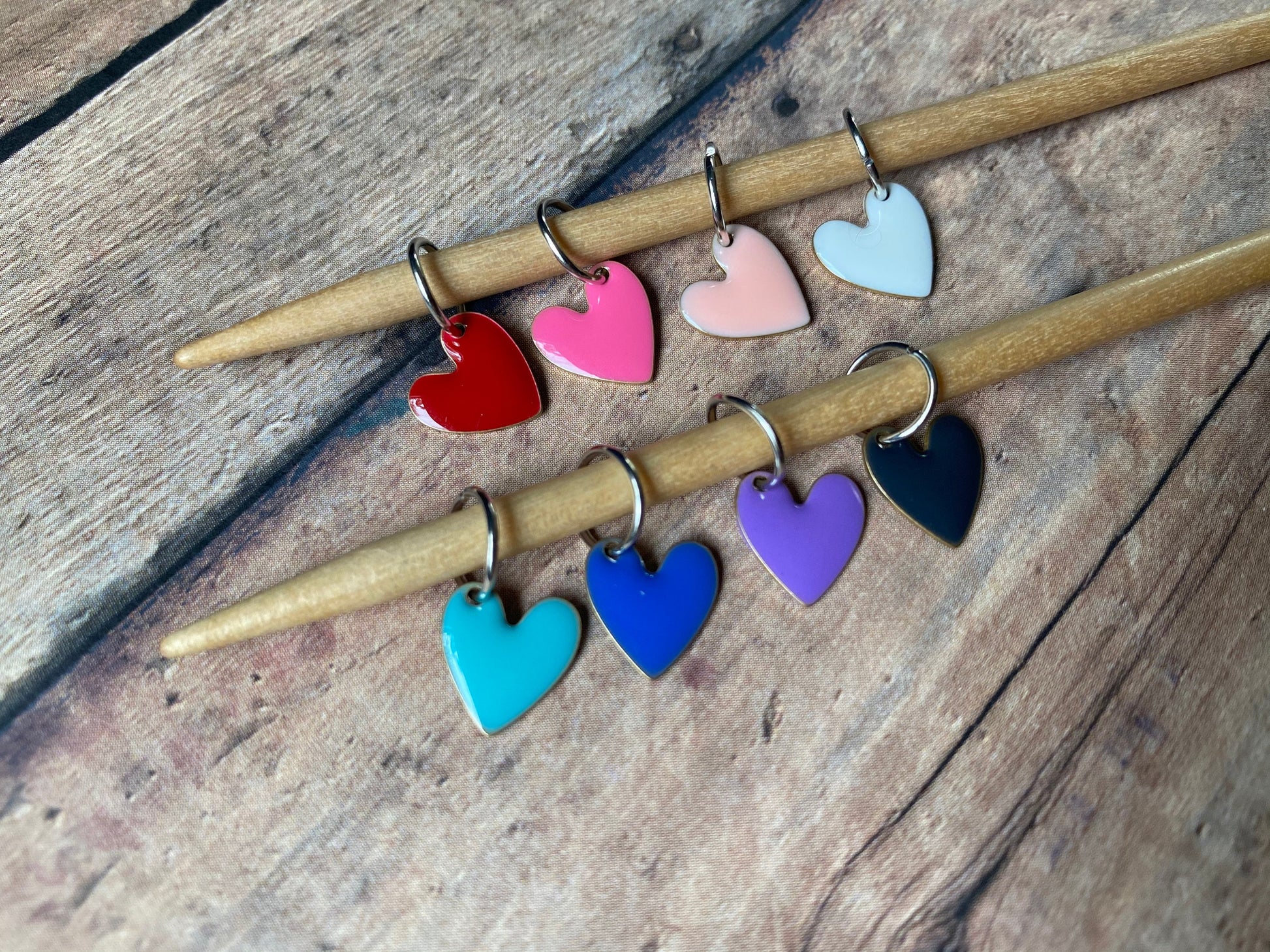 Lightweight, shimmering enamel hearts are ready to adorn your wrist or your knitting project! I've paired each heart with a silver jumpring that will fit up to a US 9/5.5 mm needle. You will receive 1 each of: red, bright pink, pale pink, white, turquoise, royal blue, navy, and purple.