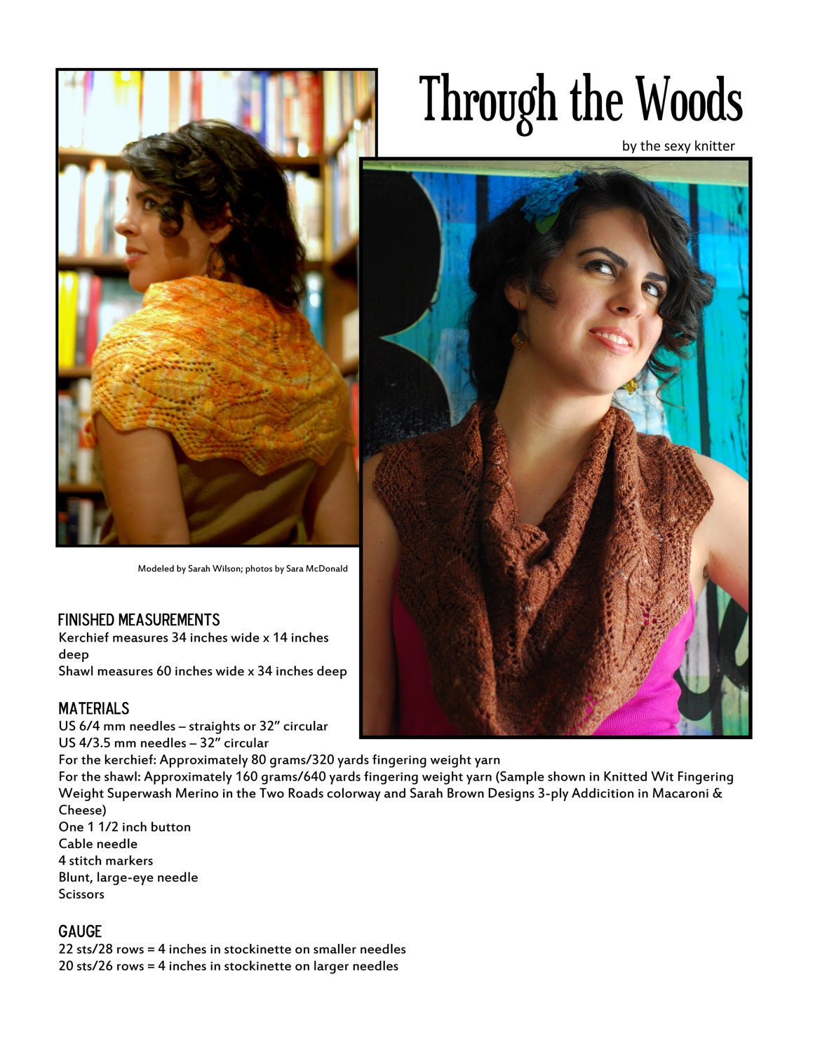 Shawlette: Approximately 80 grams/320 yards fingering weight yarn (Samples shown in Knitted Wit Fingering Weight Superwash Merino in the Two Roads colorway and Sarah Brown Designs 3-ply Addicition in Macaroni & Cheese)